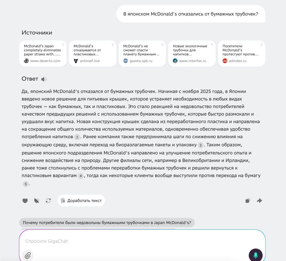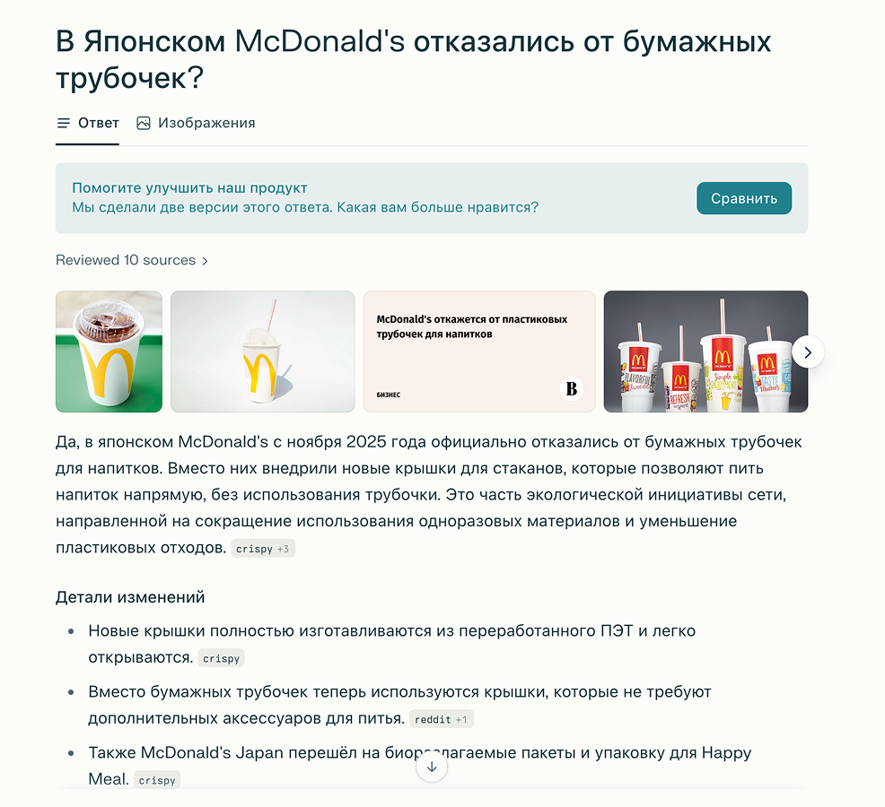 Я задал вопрос о свежей новости о том, что японский «Макдональдс» отказался от бумажных трубочек. Хотя российские СМИ почти не писали об этом, GigaChat нашел англоязычные источники и выдал актуальные данные. Perplexity справился примерно так же, только лучше структурировал информацию.