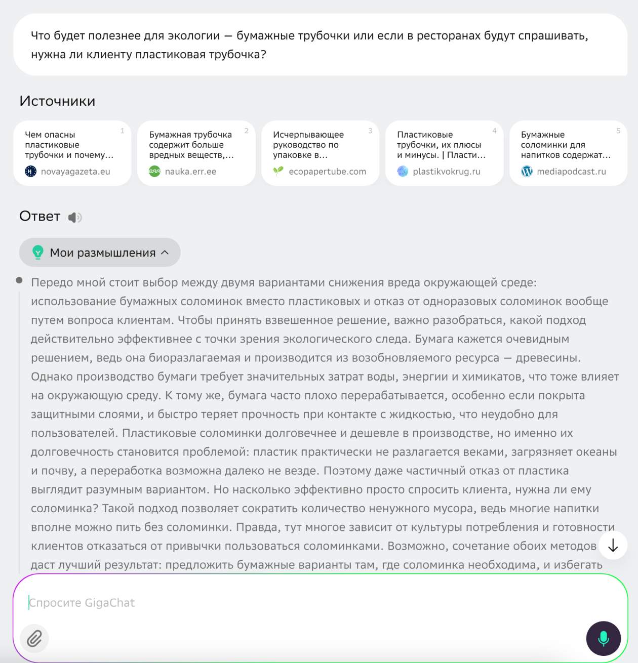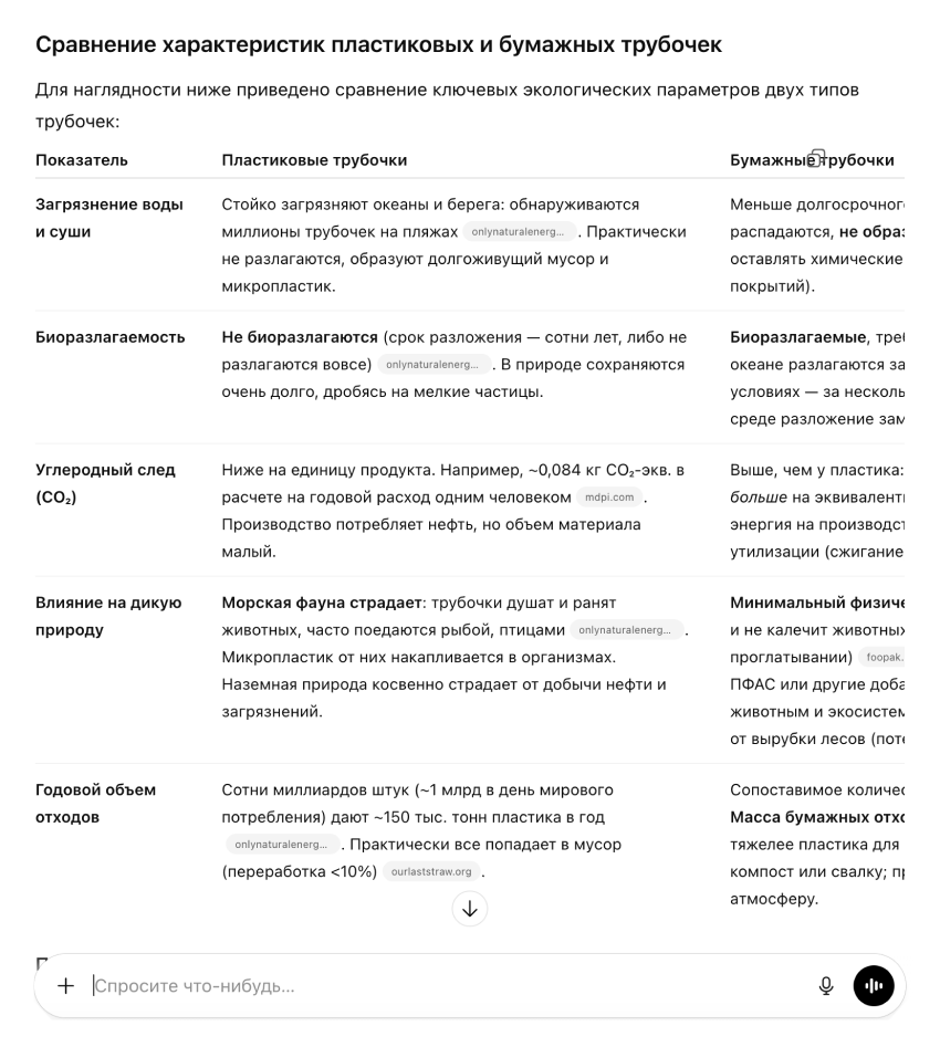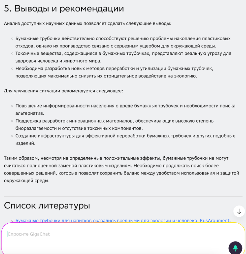 Я попросил провести исследование о пользе бумажных трубочек для экологии в объективном режиме. GigaChat подготовил краткое резюме: рассказал историю появления бумажных трубочек, перечислил их плюсы и минусы, сделал выводы и добавил список литературы, но без конкретных цифр и реальных данных. Ответ больше напоминал обзор материалов из открытых источников, чем полноценное исследование с анализом фактов.