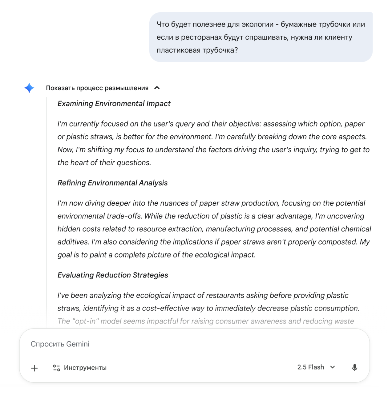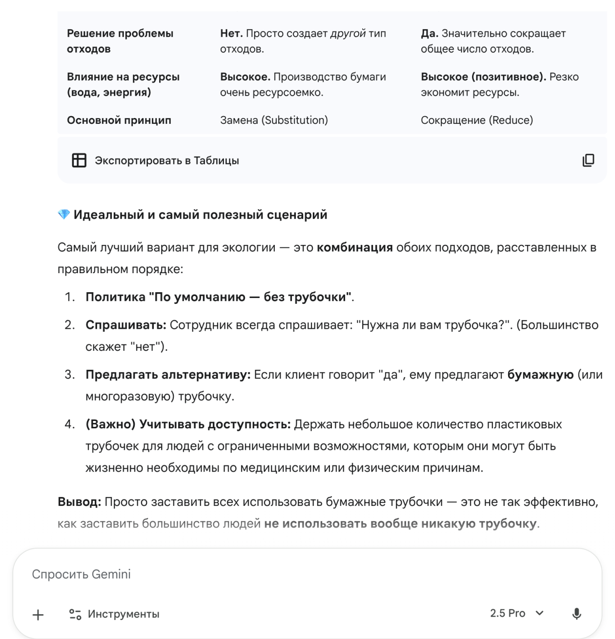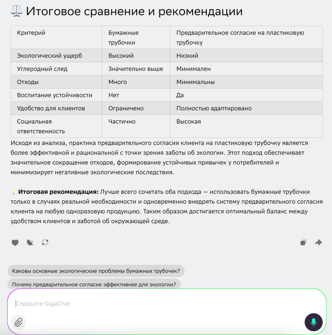 Я снова задал вопрос о бумажных трубочках — на этот раз попросил сравнить их экологическую пользу с вариантом, когда рестораны спрашивают у каждого гостя, нужна ли ему пластиковая. В итоге GigaChat подробно описал преимущества и недостатки обоих подходов, составил наглядную таблицу и добавил итоговую рекомендацию.