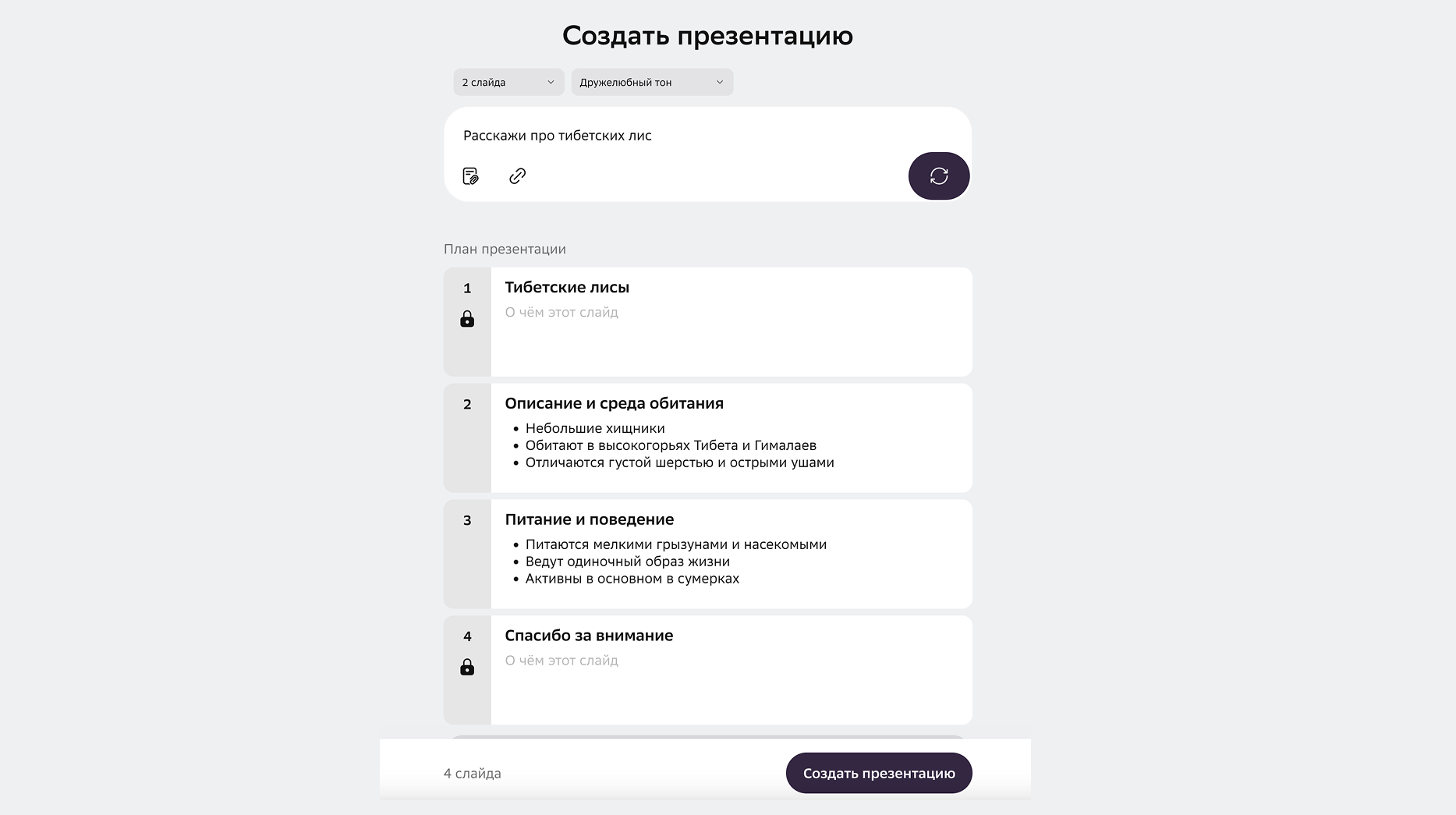 Кроме того, можно прикрепить файл до 80 Мб и добавить ссылку на источники, на которые будет опираться GigaChat. При желании доступен и вариант с готовыми темами для теста. Но меня куда меньше интересуют «Простые способы повышения продуктивности сотрудников» — я здесь ради презентации про тибетских лис.