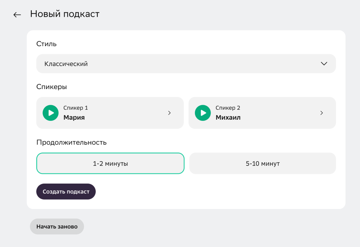 После этого сервис предлагает уточнить детали: выбрать стиль — классический, деловой, образцовый, энергичный, комичный, спокойный, вдохновляющий, утонченный или даже зумерский. Дополнительно можно настроить голоса спикеров и задать продолжительность — две минуты или десять.