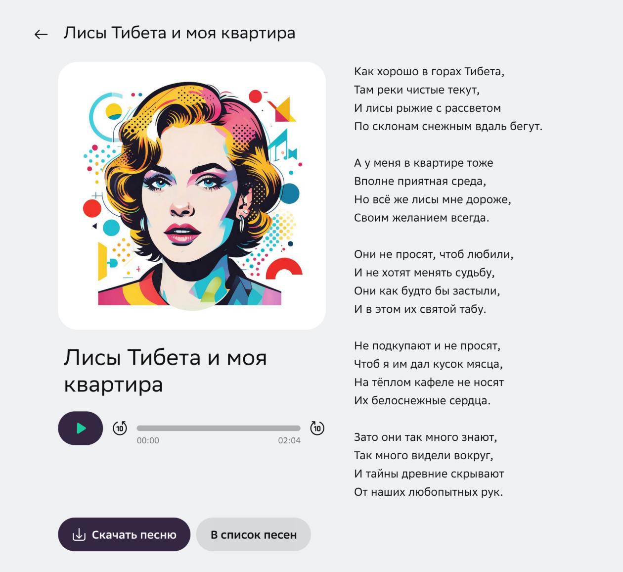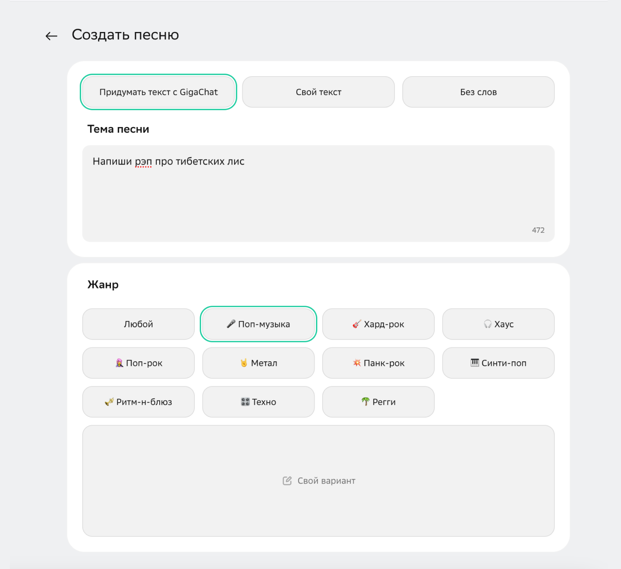 Из жанров ближе всего к рэпу оказался пункт «Поп-музыка», его я и выбрал. Во время генерации GigaChat предложил выбрать обложку — правда, почему-то решил, что на ней должна быть девушка, а не тибетская лиса.