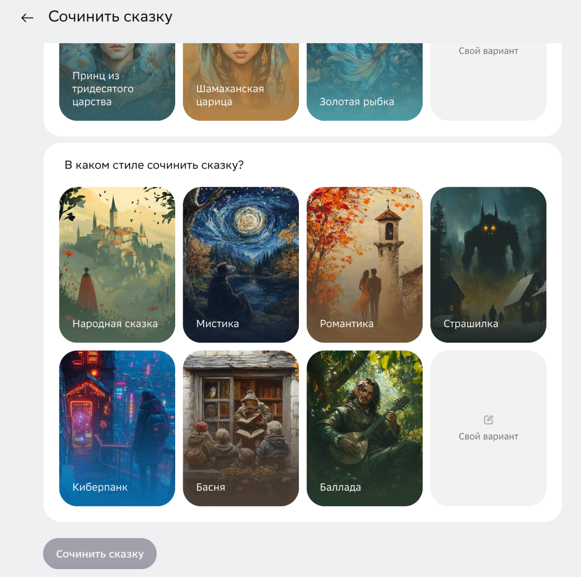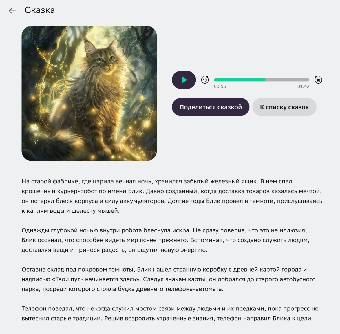 Генерировать сказки с озвучкой. В разделе «Полезное» можно создать сказку с озвучкой от ИИ. GigaChat предлагает выбрать одного из классических сказочных персонажей — золотую рыбку, Василису Прекрасную, говорящую лошадь — и определиться с жанром: мистика, страшилка, киберпанк. Я не выбирал персонажа и заказал страшилку про робота-курьера.