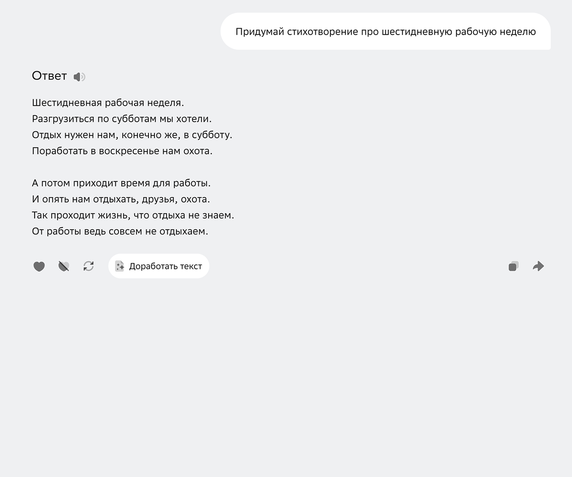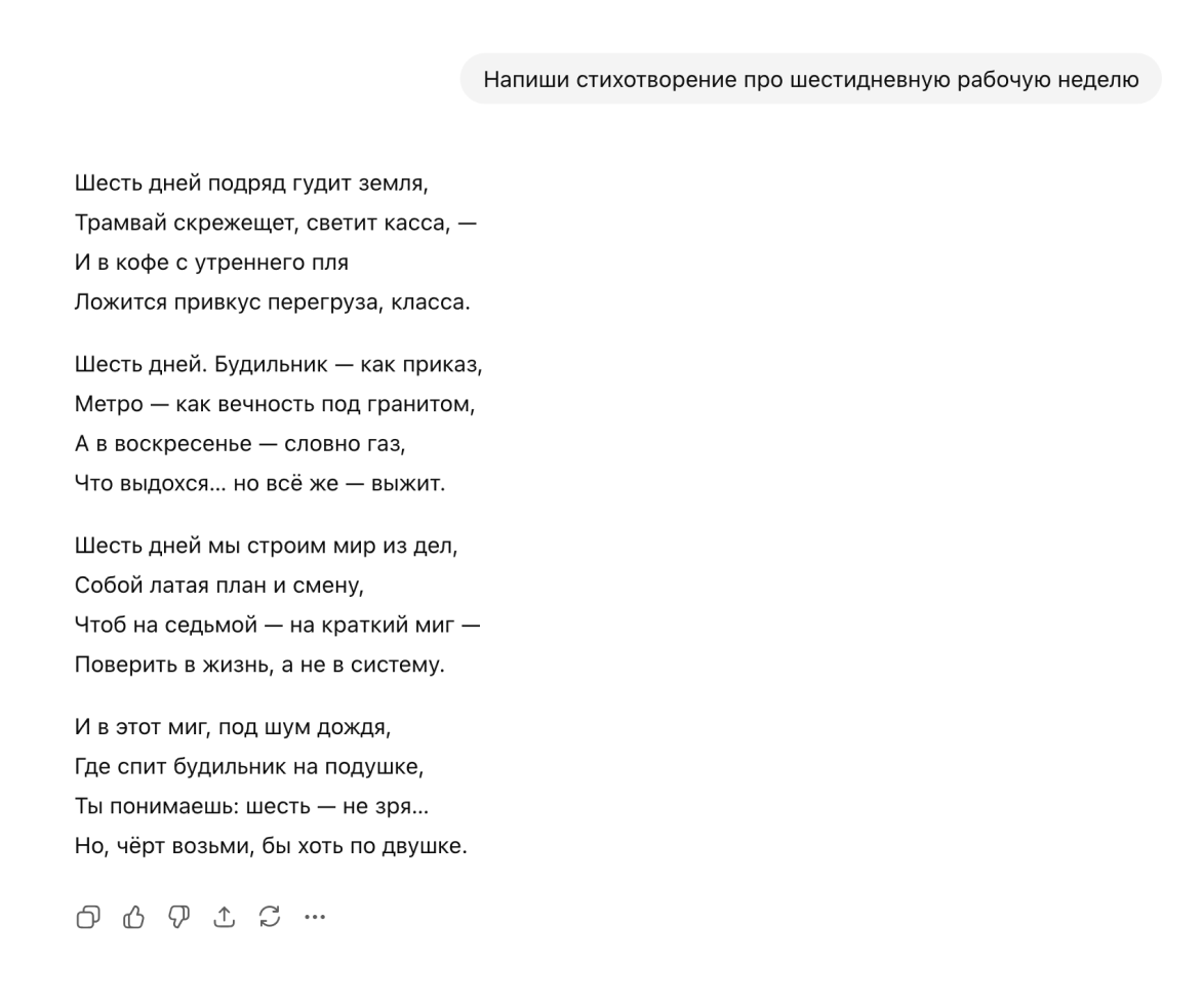 Сочинять стихи. В GigaChat есть отдельный режим для этого. Интерфейс не отличается от обычного чата, но, судя по всему, тут используют системный промпт, адаптированный под поэзию. Я попросил нейросеть написать стихотворение о шестидневной рабочей неделе, которая мне предстояла.