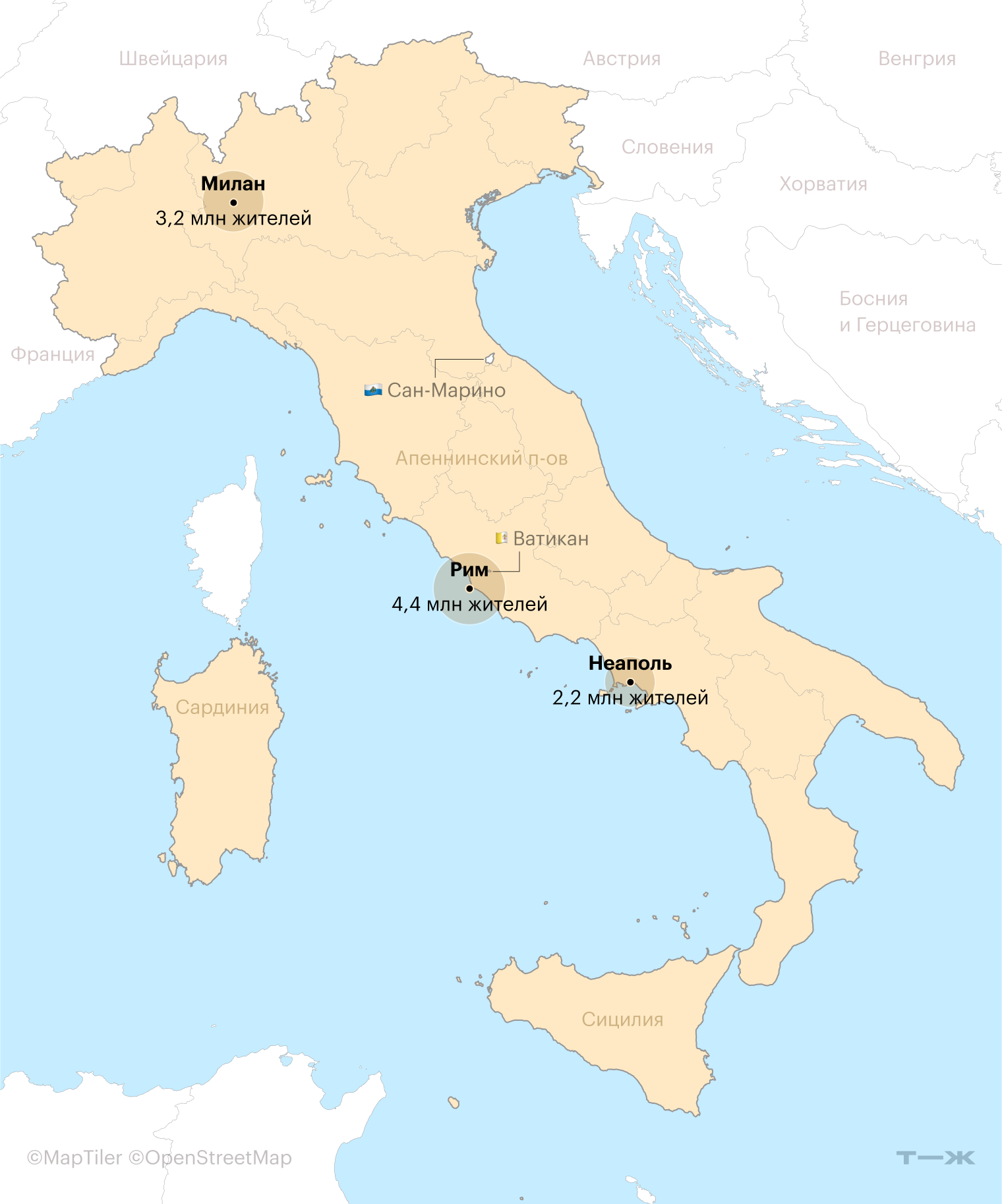 Где находится: в Южной Европе, занимает большую часть Апеннинского полуострова. Граничит с Францией, Швейцарией, Австрией и Словенией. На территории страны расположены два независимых государства — Сан-Марино и Ватикан. Италия омывается Лигурийским, Тирренским, Ионическим и Адриатическим морями.