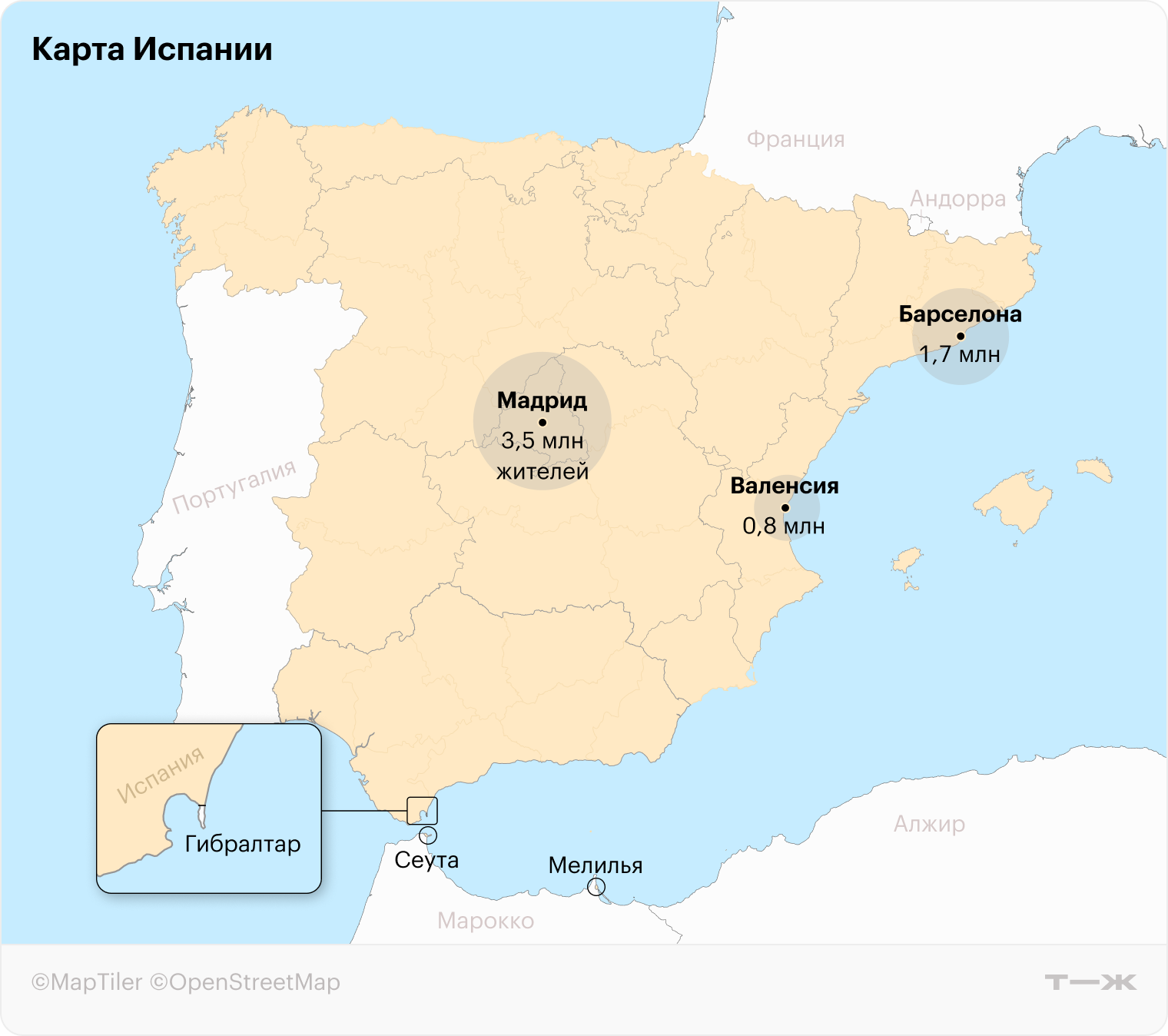 Где находится: в Юго-Западной Европе, занимает большую часть Пиренейского полуострова. Граничит с Францией и Андоррой на севере, Португалией — на западе, Гибралтаром — на юге. Канарские острова и автономные города Сеута и Мелилья находятся в Африке и граничат с Марокко. Страна омывается Средиземным морем на востоке и юге и Атлантическим океаном на северо-западе.