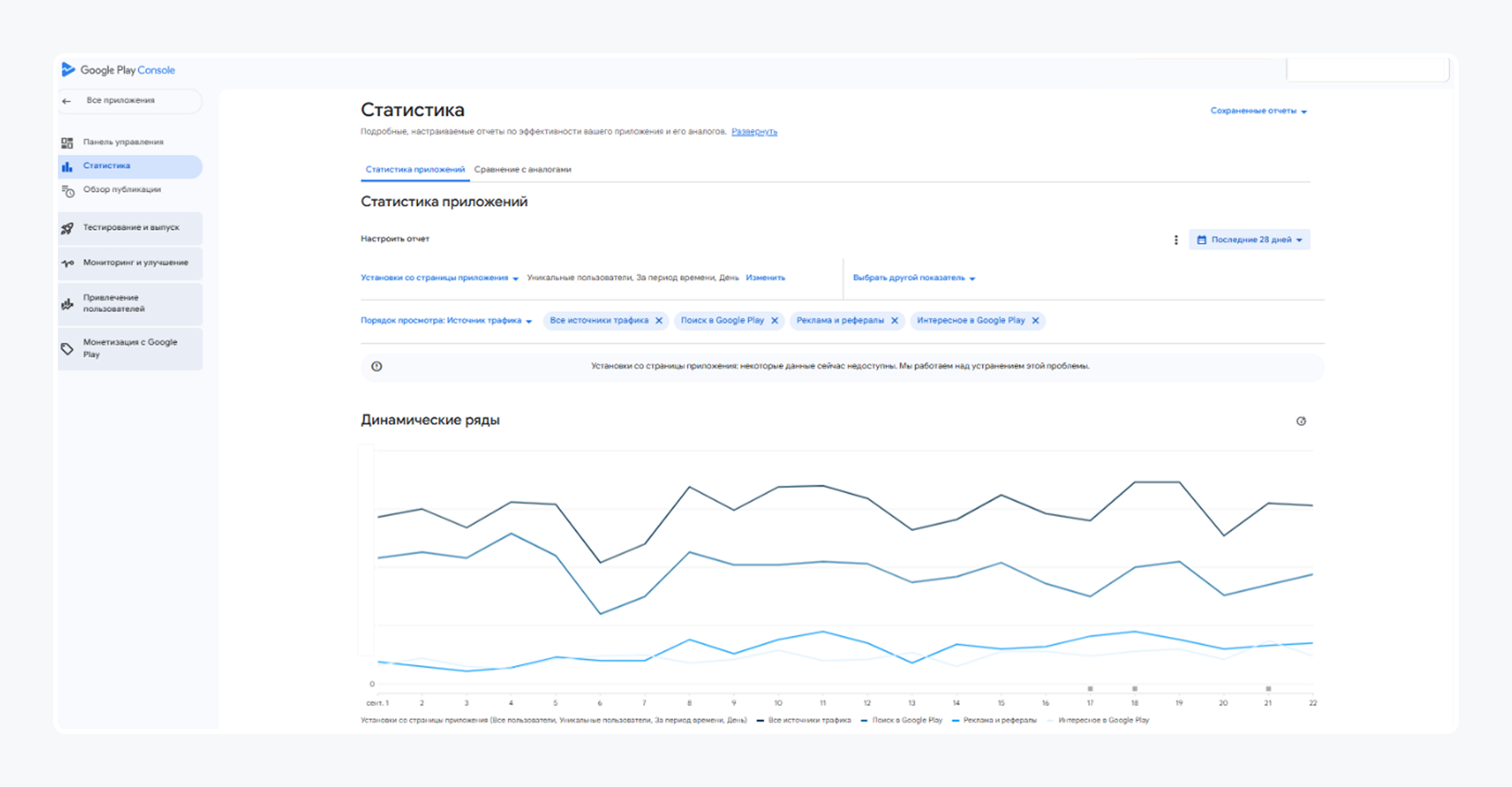 Это отправная точка любого анализа в продвижении мобильных приложений. Раздел «Источники трафика» показывает, откуда пользователи приходят на страницу приложения и что мотивирует их на установку.