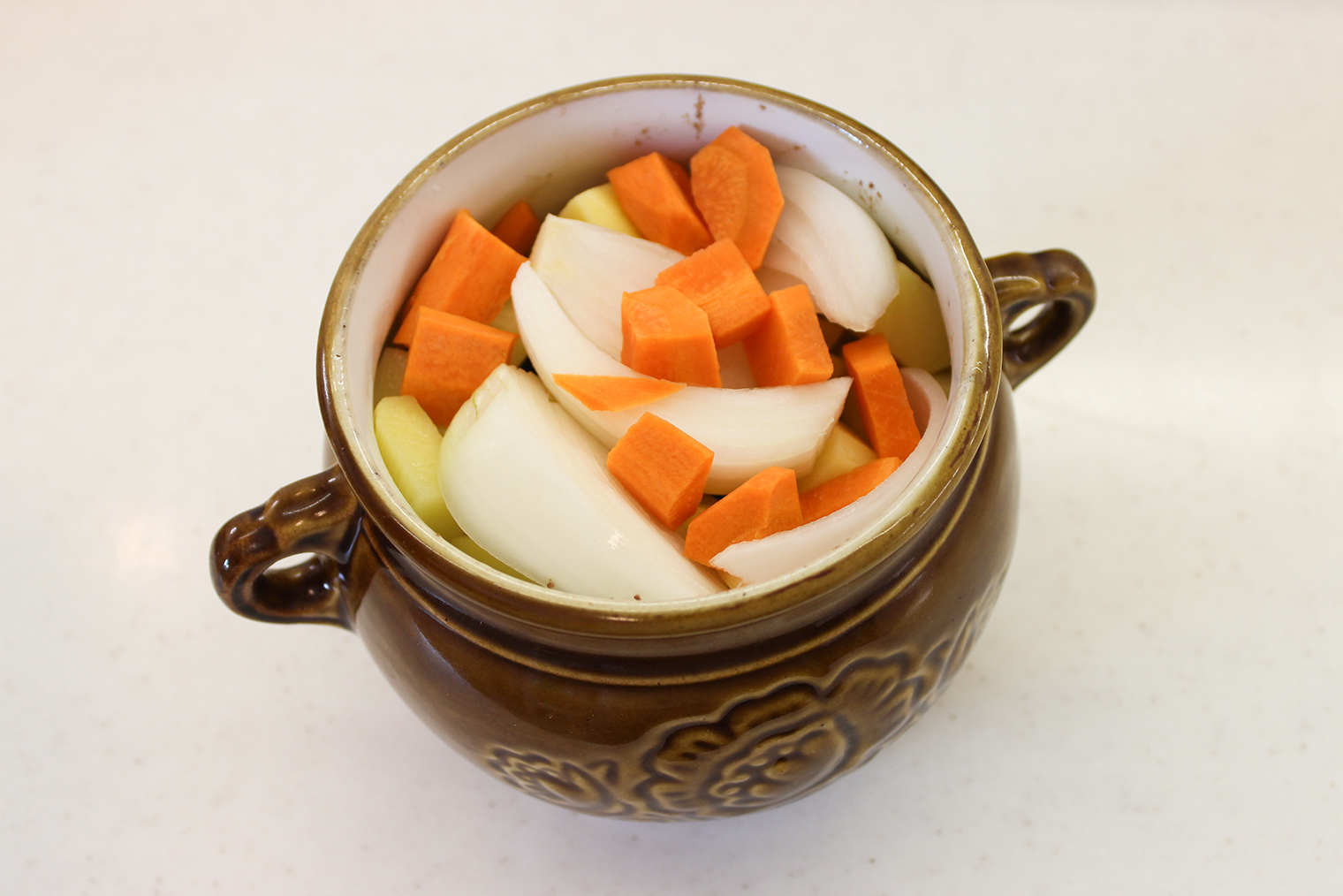 Для жаркого понадобятся глиняные горшочки. Они хорошо держат тепло, поэтому блюдо получается нежным и сочным. Мясо подойдет любое — я взяла говядину. Выбирайте недорогие жесткие отрубы вроде толстого края: долгое тушение их размягчит.