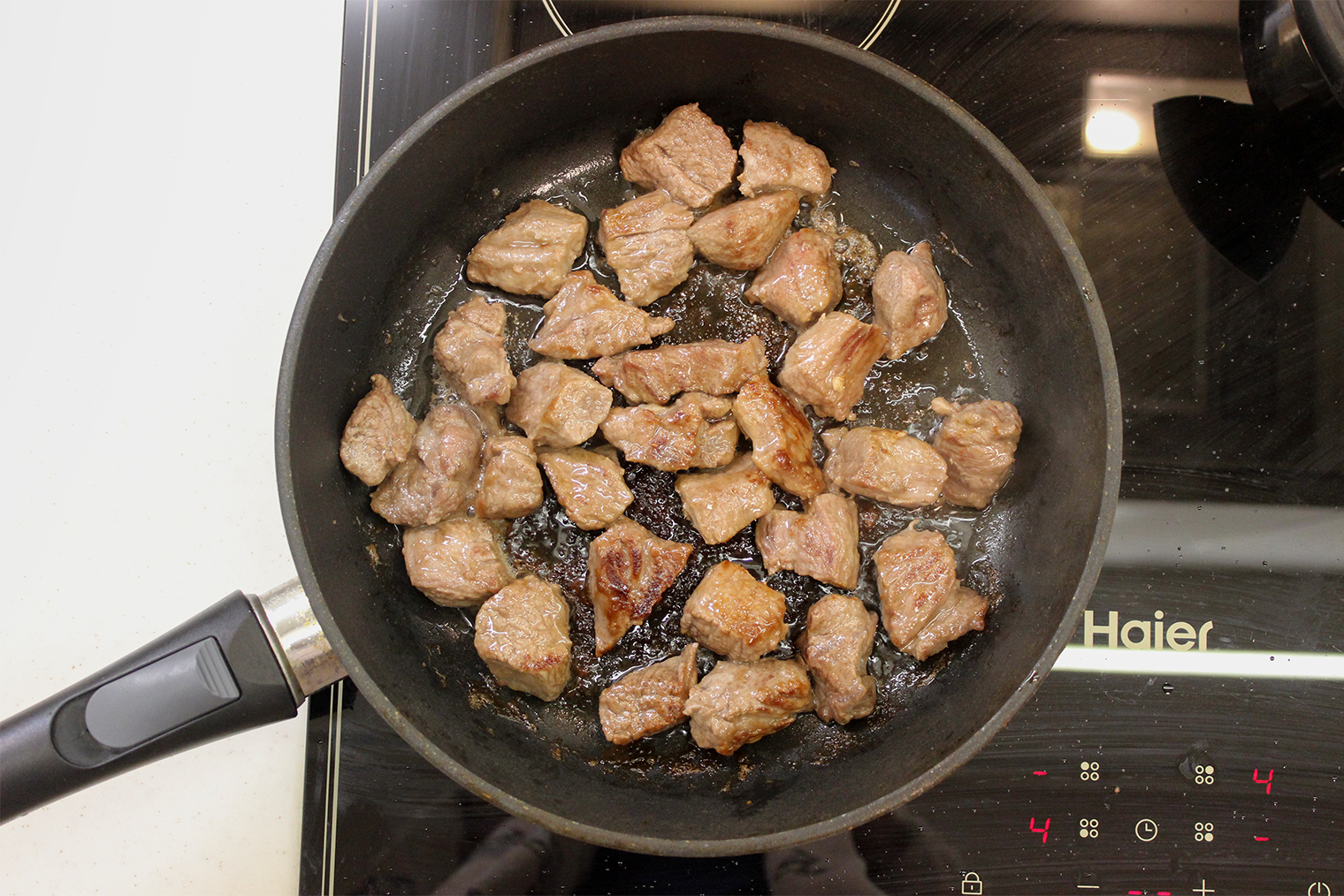 Шаг 3. Сковороду разогрейте на среднем огне, добавьте 2 ст. л. растительного масла. Мясо обжаривайте со всех сторон на средне-сильном огне до румяности — около 20 минут. Готовое мясо переложите в миску.