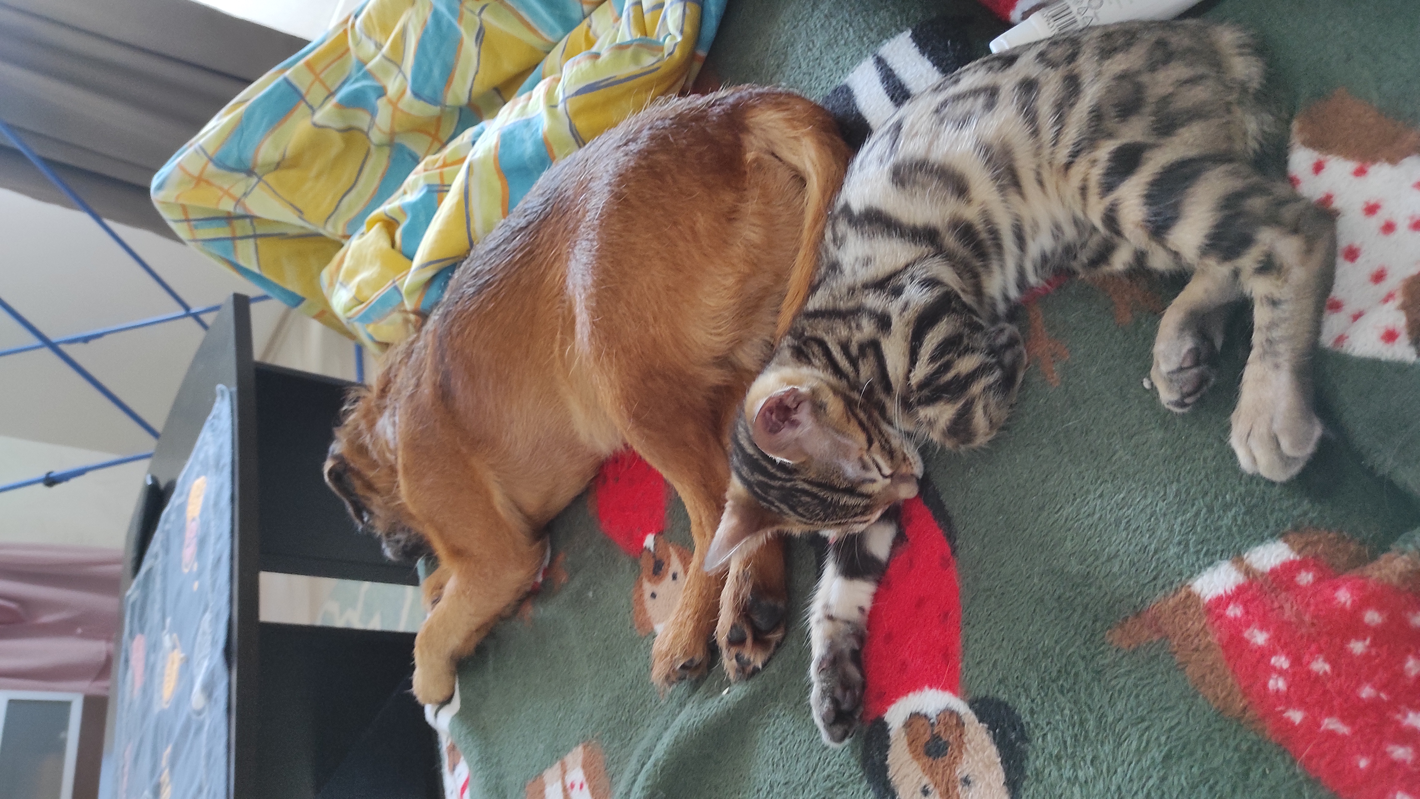 Фото питомцев: гриффон Лайк и бенгал Брют синхронно спят
