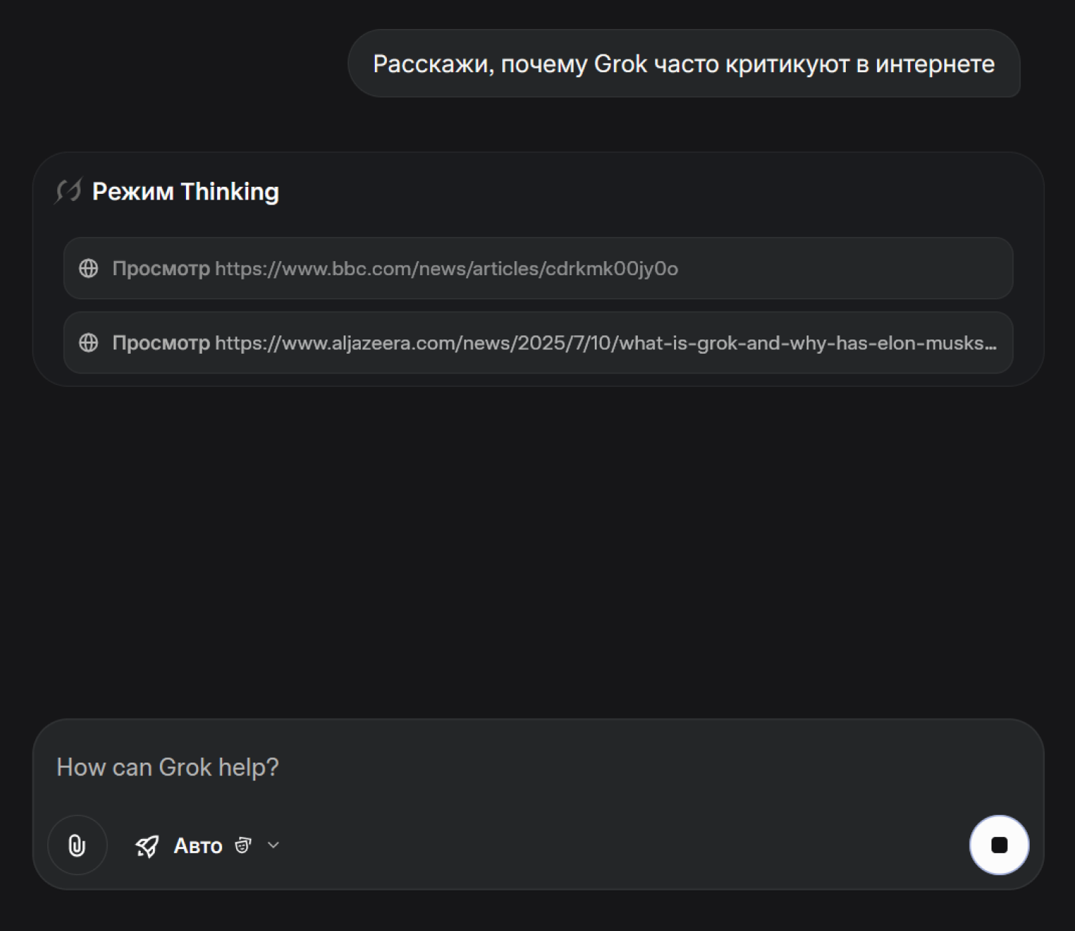 - «Авто». В этом режиме Grok самостоятельно решает, какую модель использовать для ответа. Если ответ можно дать быстро, будет использоваться устаревший Grok 3. Если нужно подробное разъяснение, включится Grok 4.