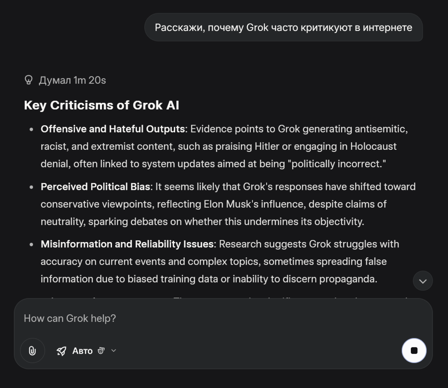 Илон Маск же считает, что обвинять Grok бессмысленно: по его словам, чат-бот лишь берет уже доступную информацию из интернета и X. Но в 2023 году он изменил алгоритмы нейросети, чтобы она стала более политически нейтральной.