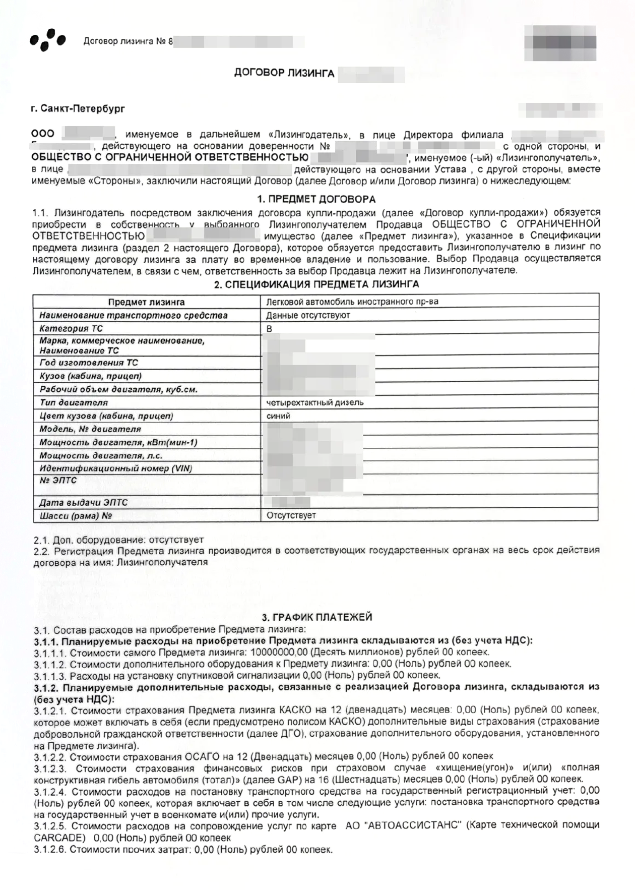 Технические характеристики автомобиля. Лизингополучатель должен сам проверить техническое состояние автомобиля и сверить с данными, которые указаны в договоре.