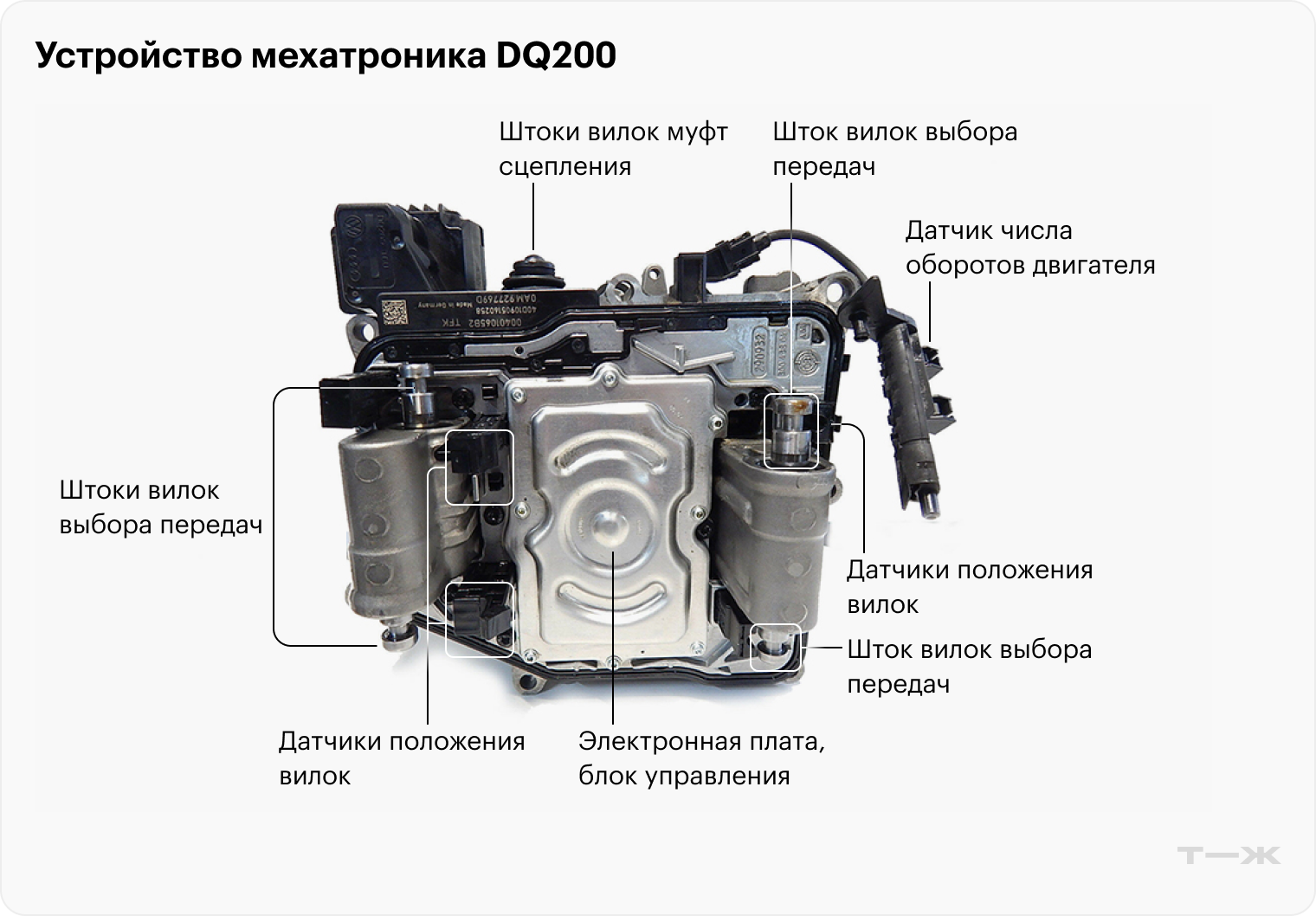 Мехатроник — блок управления коробки передач, в прямом смысле управляет ее работой. Он вовремя включает и выключает передачи, нажимает и отпускает муфты сцепления, а также обрабатывает данные с остальных блоков управления и адаптируется под конкретного водителя и манеру вождения.