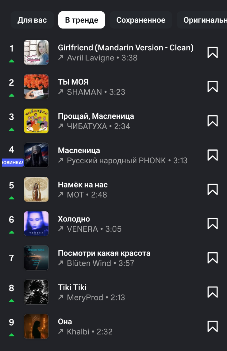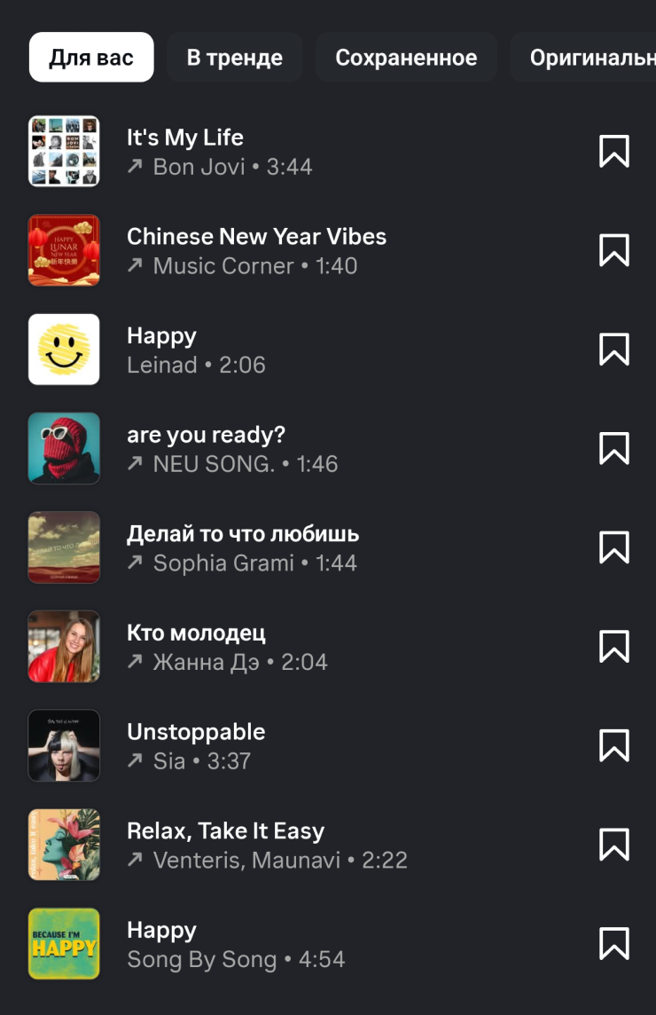 После нажатия на стикер музыки появится меню выбора треков. Глобально там есть четыре раздела: «Для вас» с персональными рекомендациями на основе прошлых действий, «В тренде» с популярными треками, а также «Сохраненное» и «Оригинальное аудио» от пользователей платформы. В верхней части экрана есть поисковая строка — с ее помощью можно найти интересующую вас песню. Нажмите на трек, который хотите добавить в сторис.