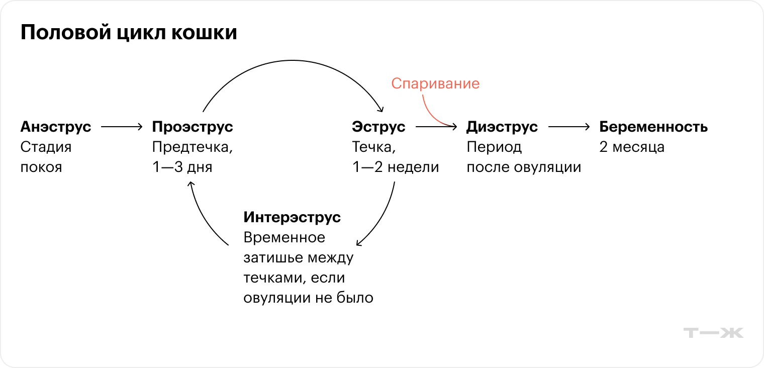 Кошки и коты нередко созревают уже к 4—5 месяцам. Половой цикл самок состоит из нескольких этапов — их схему вы найдете ниже.