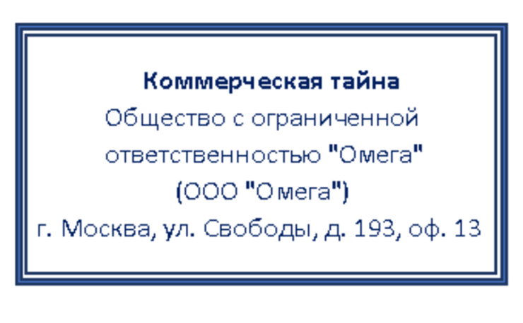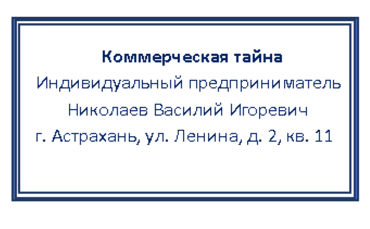 - Добавьте на носители с данными, составляющими коммерческую тайну, соответствующий гриф и укажите их обладателя: для компаний — полное наименование и местонахождение, для ИП — фамилию, имя, отчество. Это может быть печать, надпись от руки, наклейка — если гриф проставляется, например, на флешке или жестком диске компьютера. А еще его можно печатать сразу на бланке документа. Главное, чтобы было видно, что информация на носителе относится к коммерческой тайне и кто ее владелец.