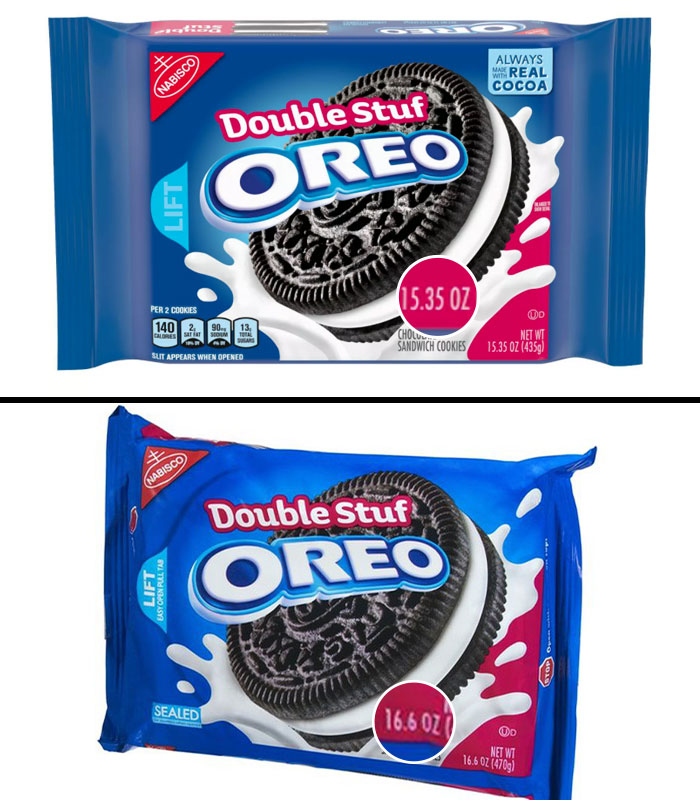 Газировка «Кока-кола». Компания «Кока-кола» в Великобритании еще в 2014 уменьшила объем бутылок с двух до 1,75 литра. Позже в 2018 году в связи с налогом на сахар компания сократила объем уже до 1,5 литра и немного подняла цену. Кроме «Кока-колы» свои упаковки ужимали «Хайнц», «Лейс», «Орео», «Марс» и многие другие мировые бренды.