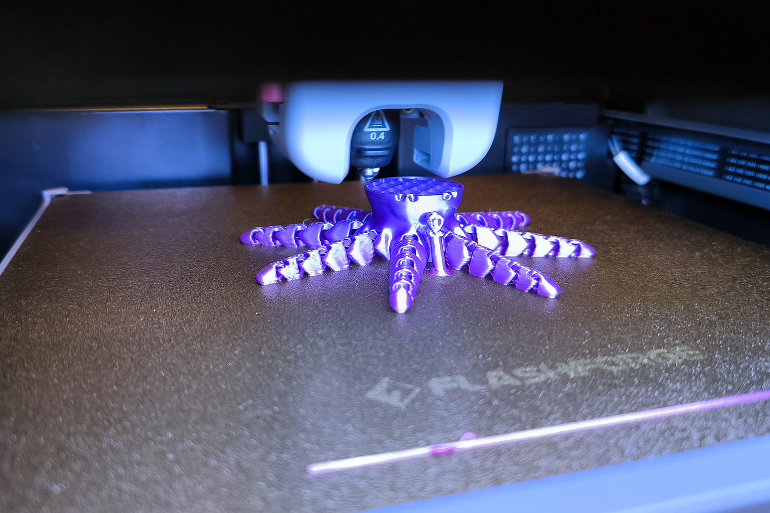 Процесс печати выглядит так: принтер водит соплом по стеклянному столику, печатая жидким пластиком первый слой предмета. Затем поднимается на второй, третий и так далее. Толщина каждого слоя в зависимости от настроек печати составляет от 0,05 до 0,3 мм.