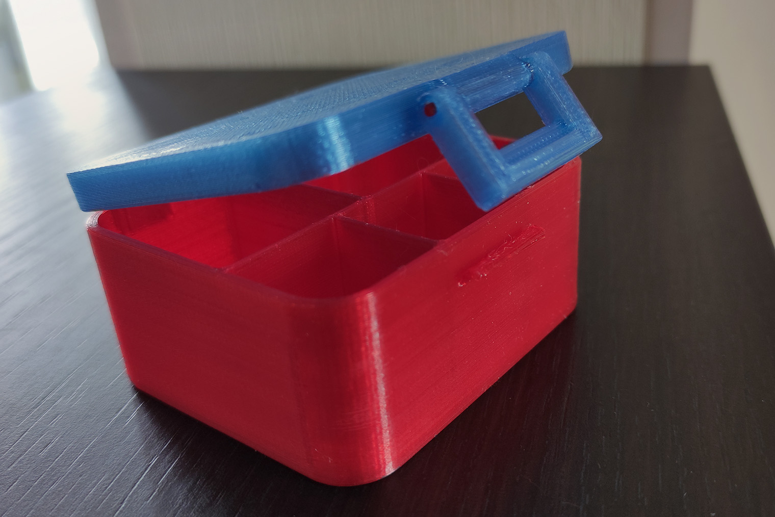 Да, проблема редкая, но для нас была довольно серьезной. Муж спроектировал и напечатал оригинальную коробку с небольшим скруглением на передней стороне, чтобы она смотрелась элегантнее. Коробка печаталась 12 часов, на нее ушло около 150 г пластика и 3,6 кВт электроэнергии: принтер потребляет 300 Вт в час.
