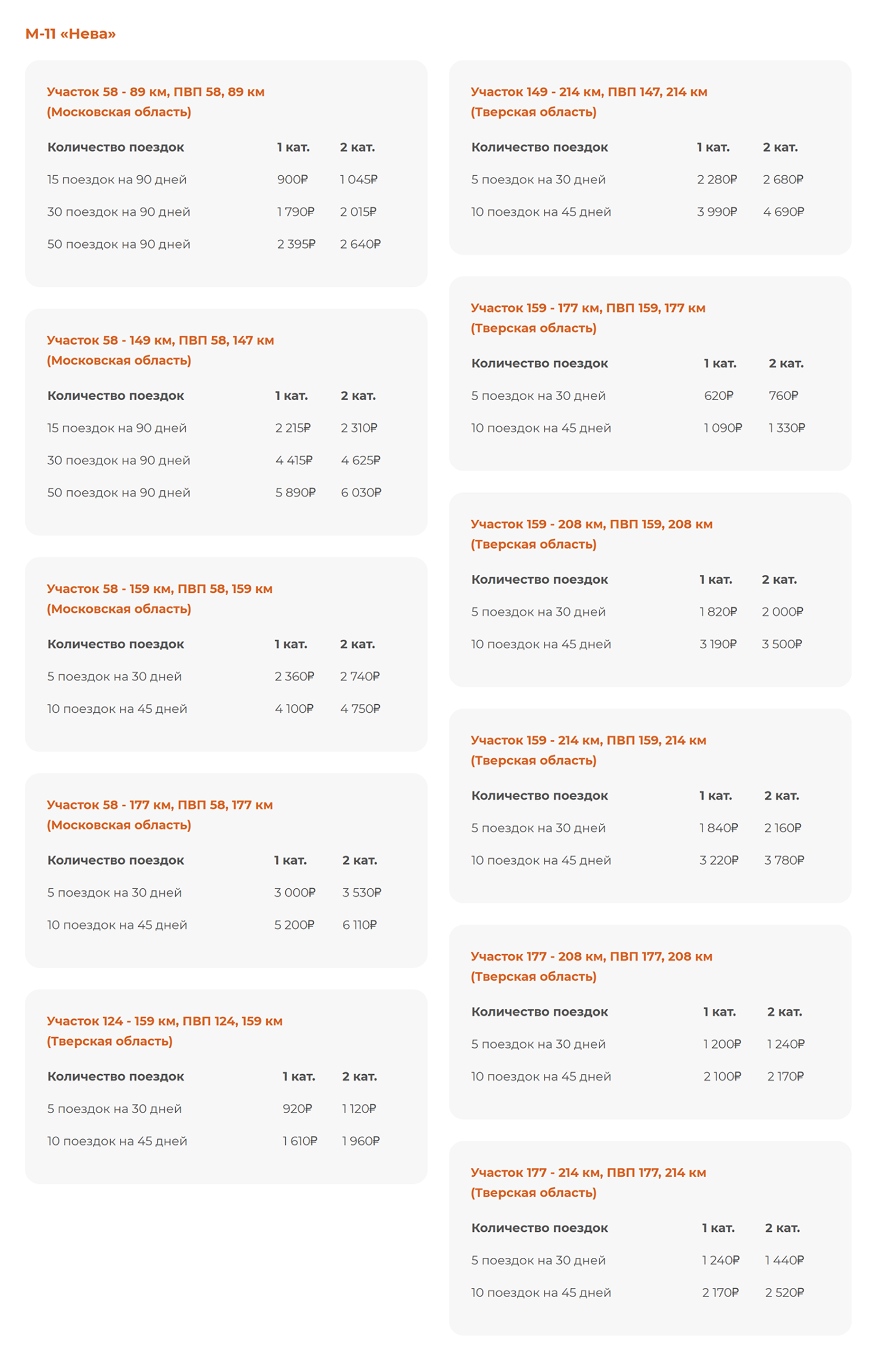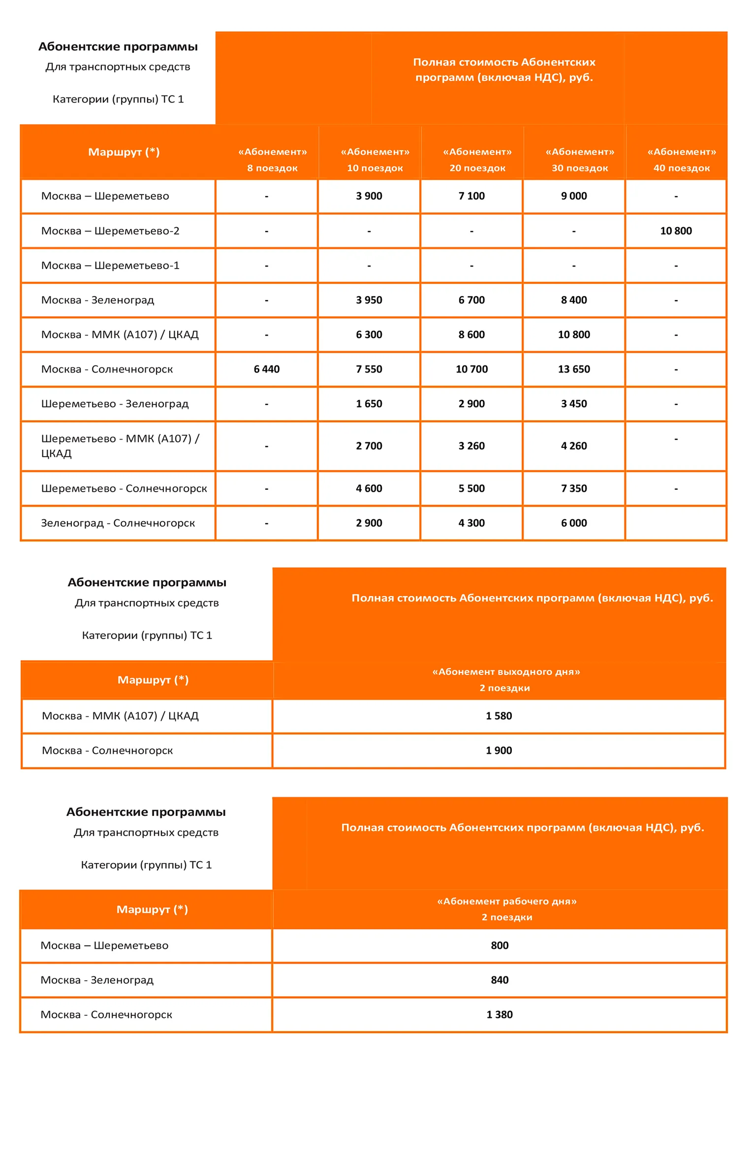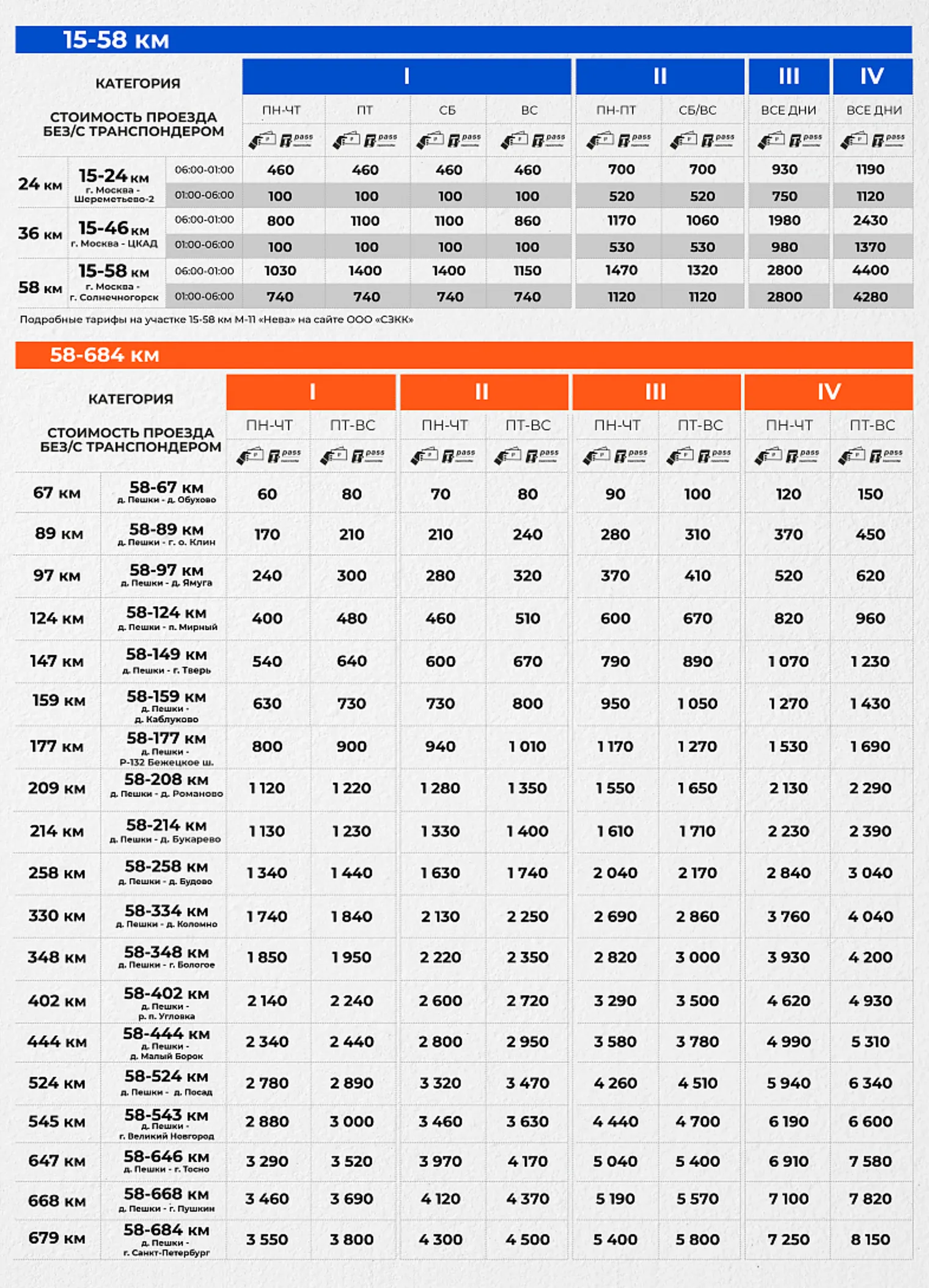 У СЗКК есть абонементы на две поездки в выходные или рабочие дни, оба действуют только на участке 15—58 км трассы М11.