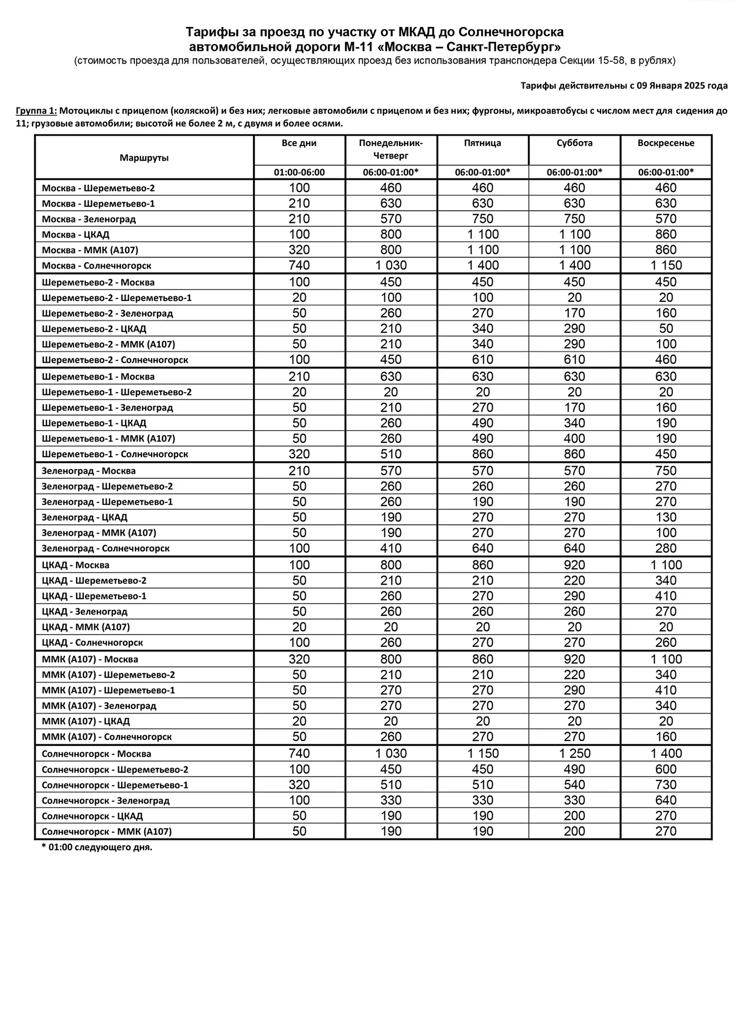 Тарифы на проезд по М11 зависят от времени суток, способа оплаты и типа автомобиля.