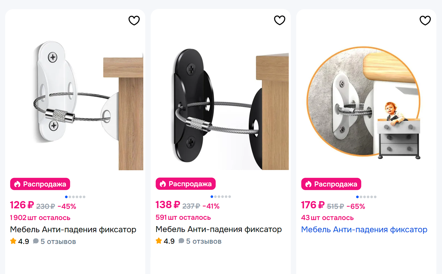 Система «антиопрокидывания» для мебели и техники пригодится, если стеллаж, комод или шкаф могут упасть. Такие системы особенно важны для узких комодов с выдвигающимися ящиками. Пока ящики внутри корпуса, комод очень устойчив. Но если ребенок выдвинет ящик — особенно верхний — до упора на себя, комод легко падает. Цена системы антиопрокидывания — 4 500—17 000 ₽.