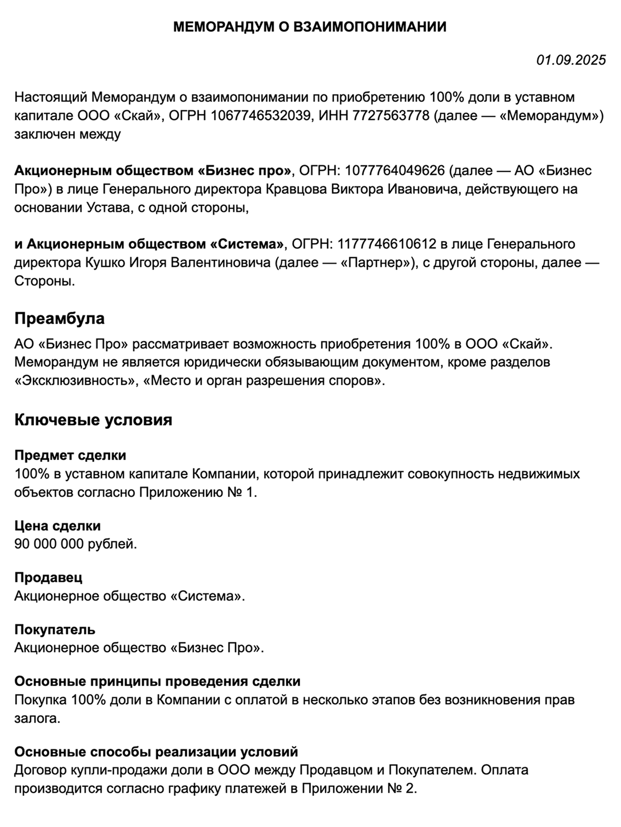 Как только покупатель найден, советую заключить меморандум о взаимопонимании. Этот документ ни к чему юридически не обязывает, но помогает сторонам зафиксировать общее понимание структуры сделки и составить план действий.