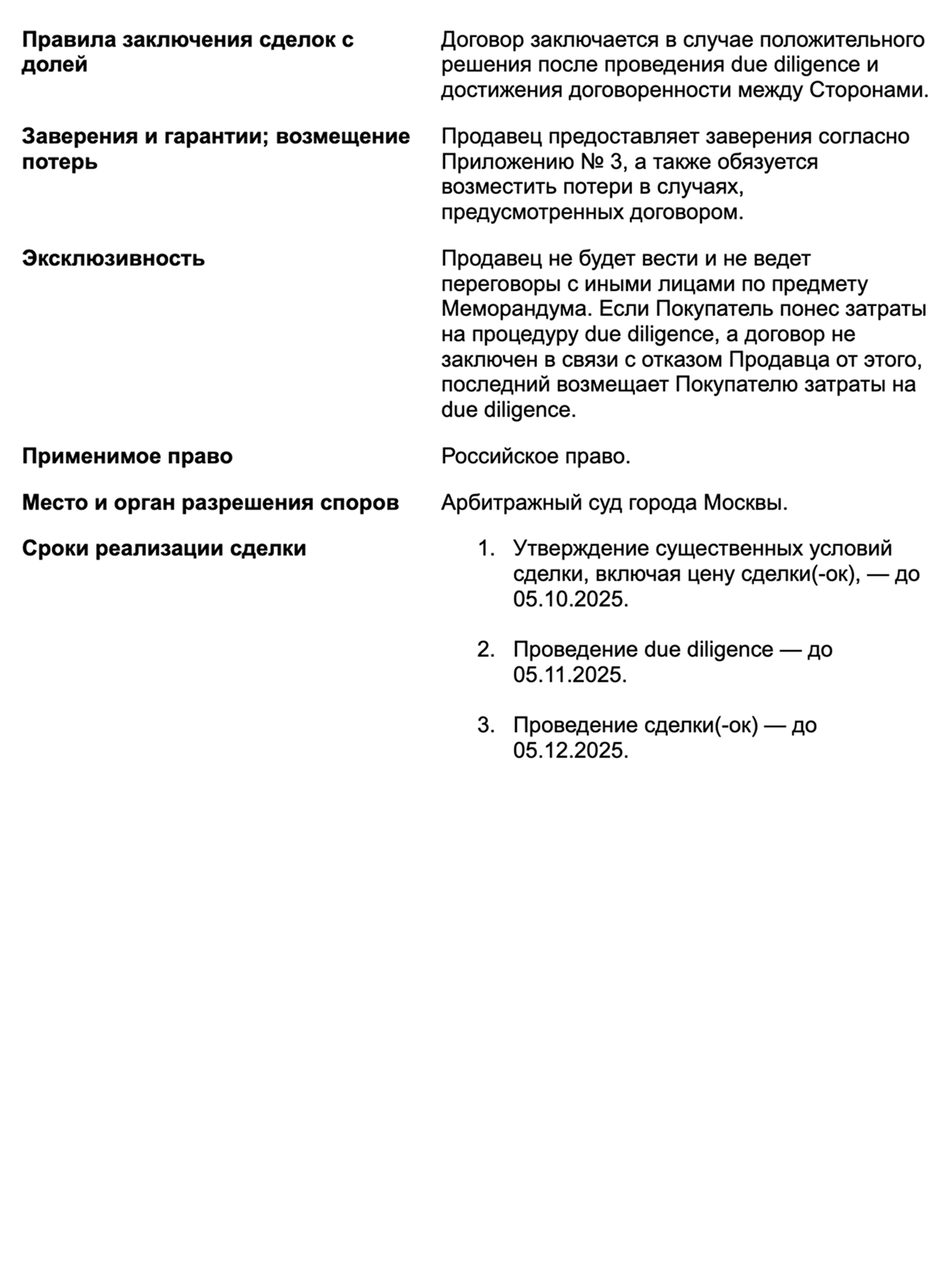 - Существенные условия будущей сделки, например сроки оплаты и передачи документов, основные заверения и гарантии, этапы проверки бизнеса.