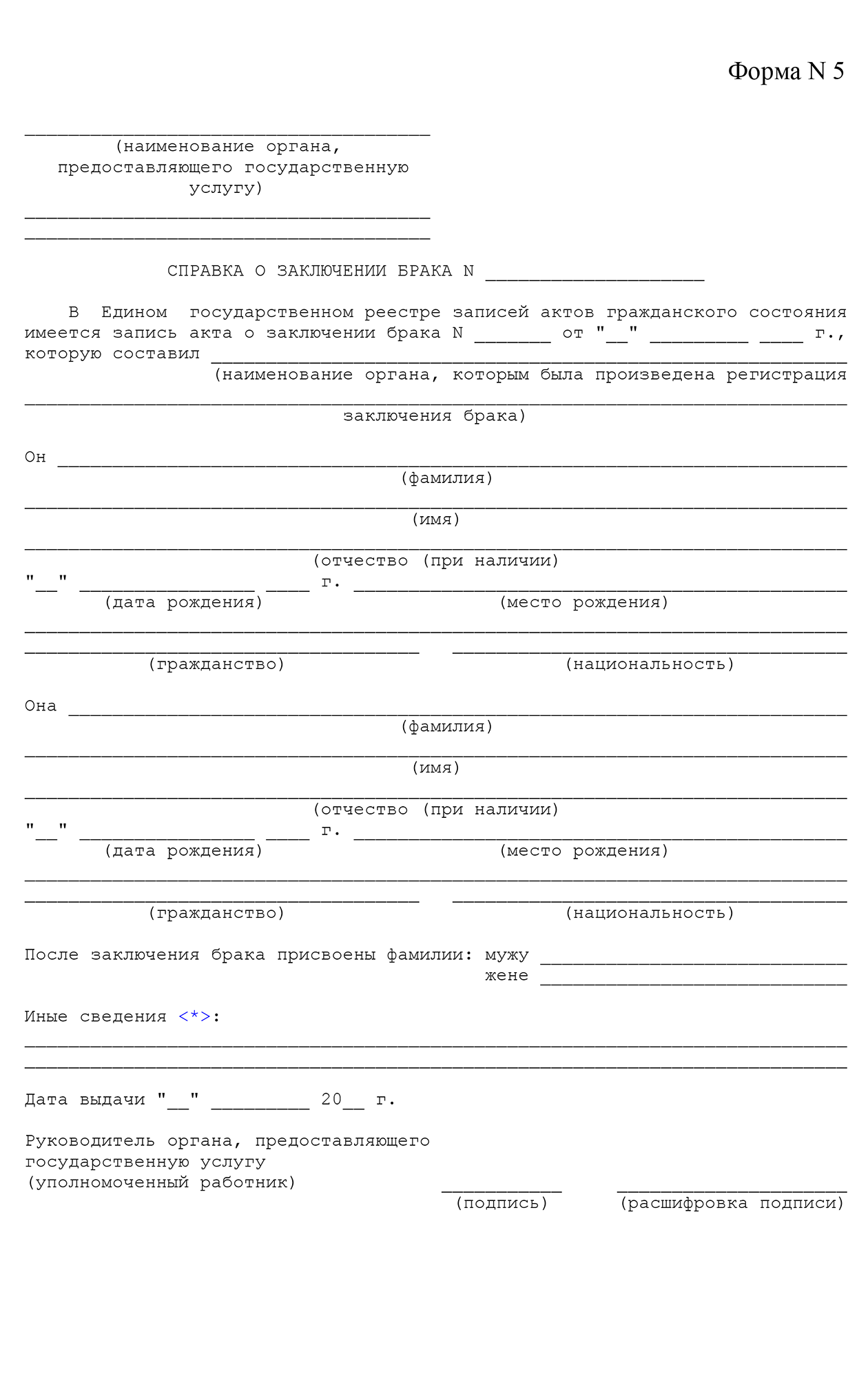 - Справку по форме 5 для подтверждения действующего брака. Она содержит те же самые сведения, что и свидетельство, но в ней указывают, что человек состоит в зарегистрированном браке на дату получения документа.