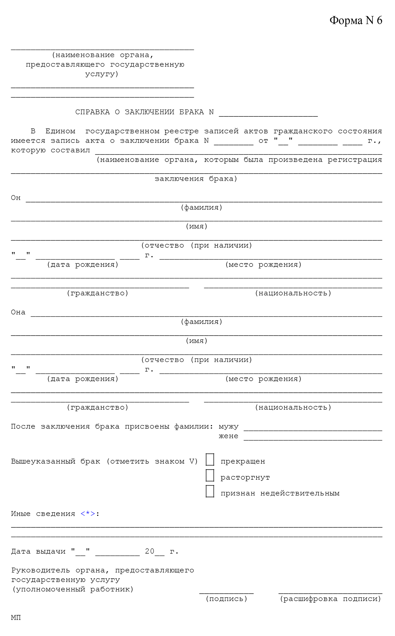- Справку по форме 6 для подтверждения расторжения брака — в ней указывают, что супруги оформили развод или брак прекращен в связи со смертью второго супруга.