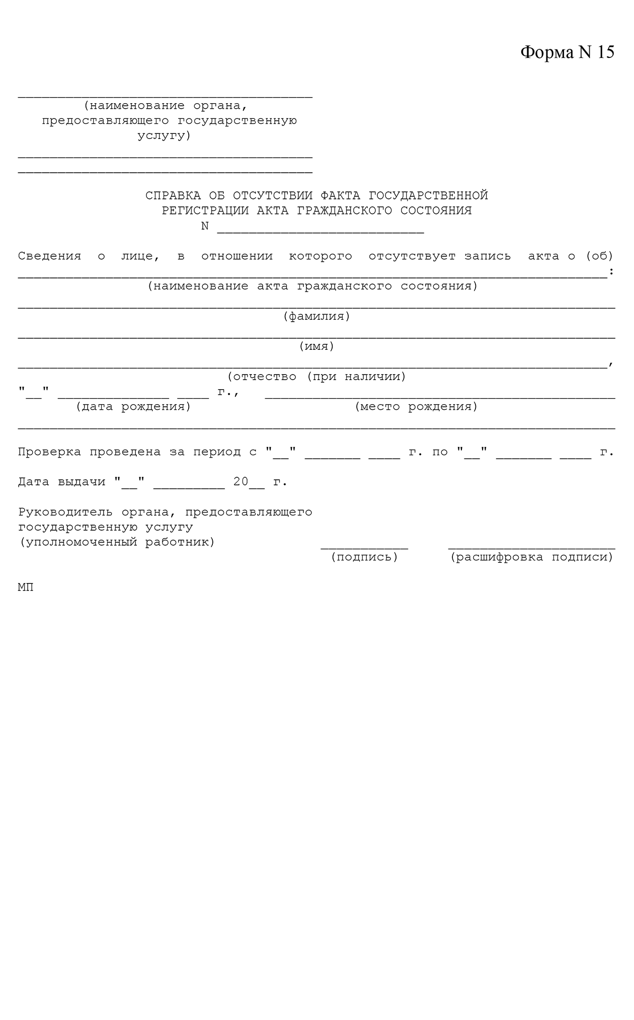 Заемщик, который никогда не состоял в браке, предоставляет справку по форме 15 — это документ о том, что с момента совершеннолетия и до даты получения справки человек не состоял в браке.