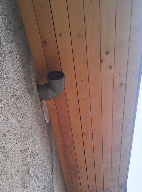 Чтобы не дырявить крышу, я вывел его с помощью горизонтального участка трубы через фронтон прямо под коньком кровли.