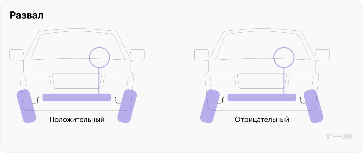 Отрицательный развал — когда нижняя часть колеса выступает наружу относительно ступицы. Автомобиль с таким развалом более устойчив в поворотах.