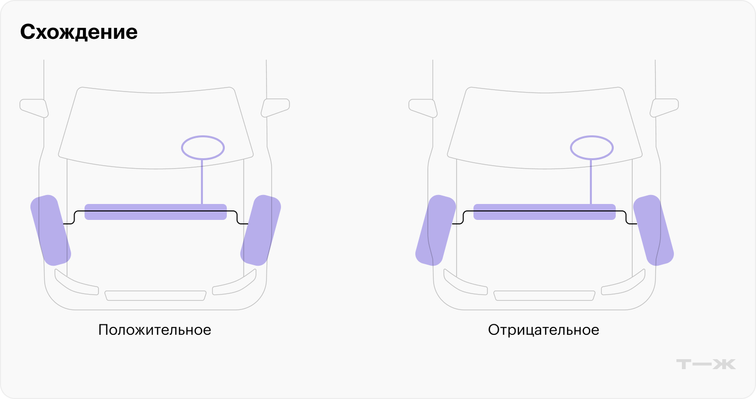 Положительное схождение — когда передняя часть колес обращена внутрь. Отрицательное — когда наружу.
