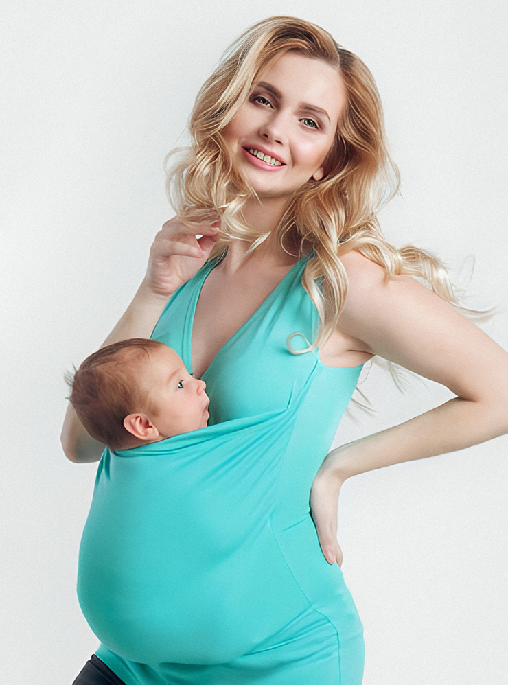 Трикотажный слинг-шарф похож на обычный, но научиться пользоваться им проще: ткань легко тянется и принимает нужную форму. Долго носить его не получится: когда ребенок будет весить 6—7 килограммов, ткань начнет провисать.