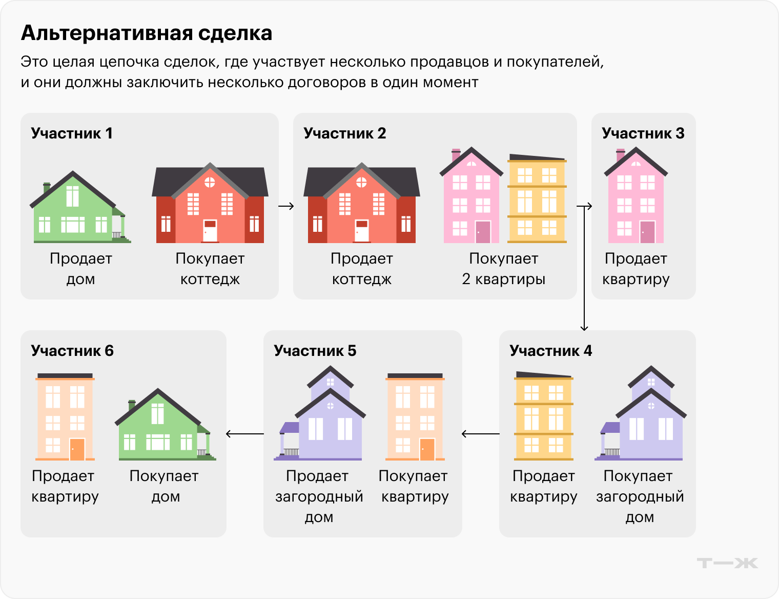 Альтернативная сделка — когда собственник продает квартиру и параллельно покупает взамен новую. Обычно в жизни это выглядит сложнее: есть целая цепочка сделок, где участвует несколько продавцов и покупателей, и они должны заключить несколько договоров в один момент.