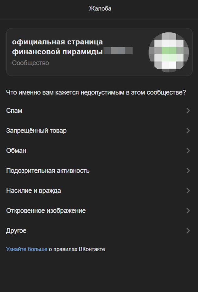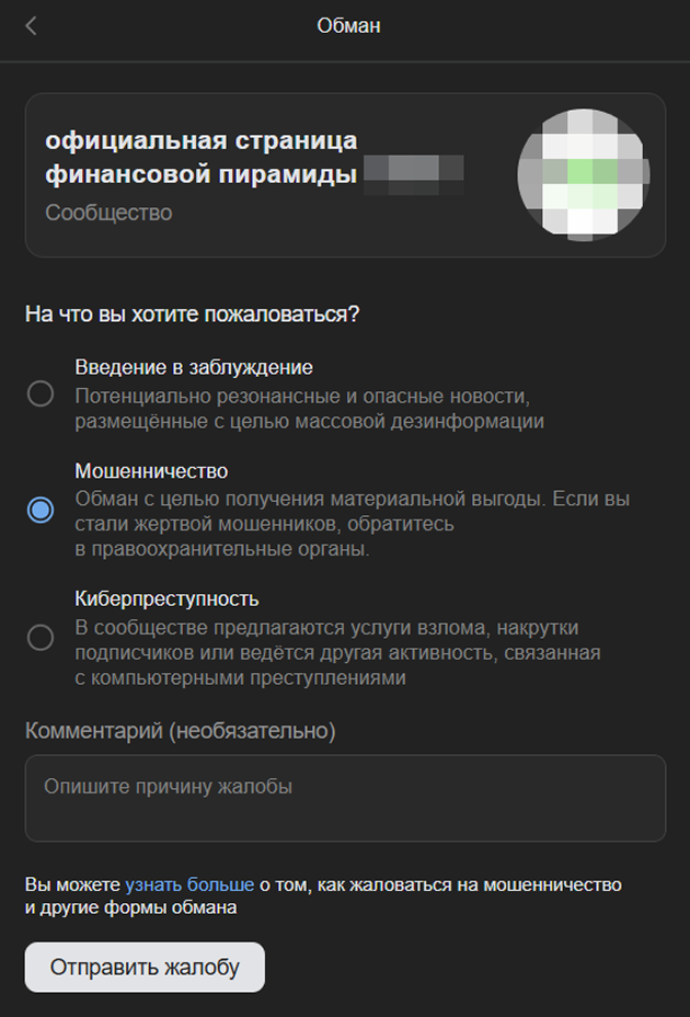 Чем больше людей будет жаловаться, тем быстрее и чаще будут блокировать страницы мошенников — и тем труднее им будет обманывать.