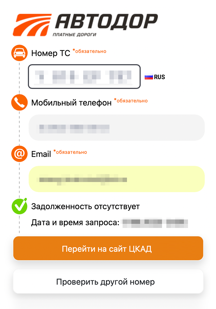На главной странице есть вкладка «Оплата проезда на ЦКАД и М12». Чтобы оплатить проезд, нужно ввести госномер автомобиля, мобильный телефона и адрес электронной почты, на который пришлют чек.