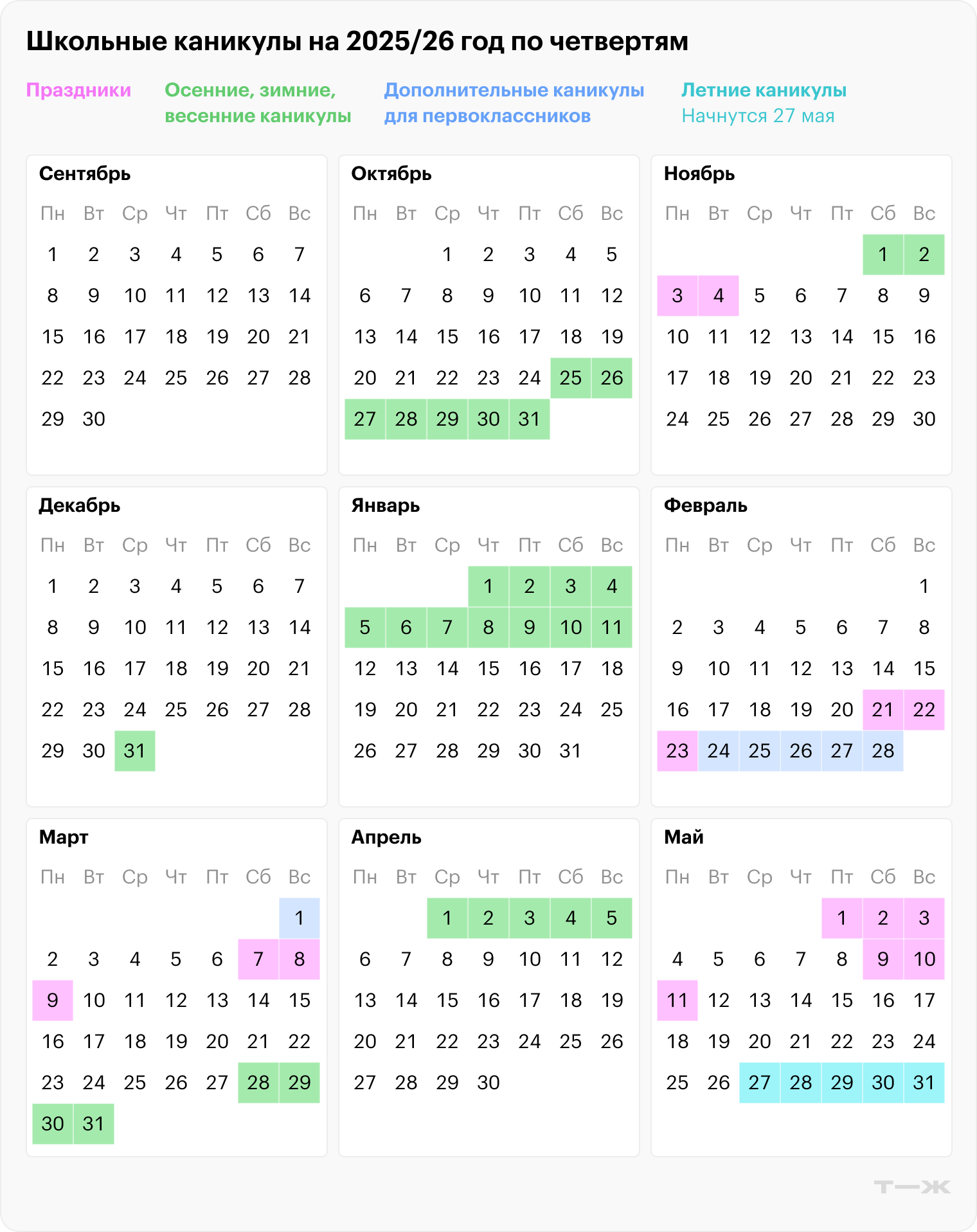 Кроме того, в третьей четверти, самой длинной, предусмотрены дополнительные каникулы для первоклассников — с 21 февраля по 1 марта 2026 года . Это тоже не зависит от того, как учится ребенок, по четвертям или триместрам.