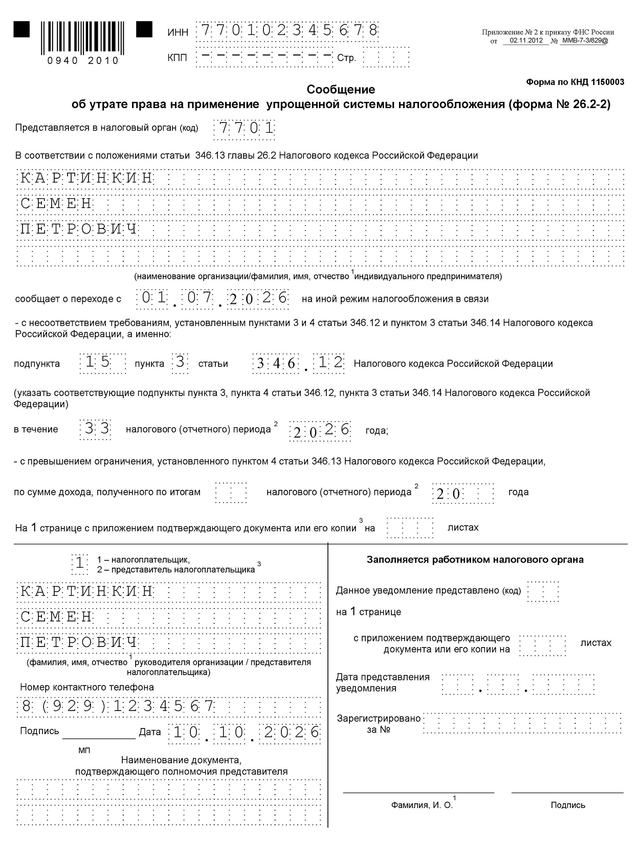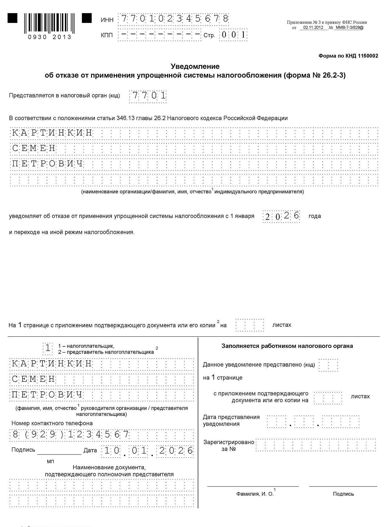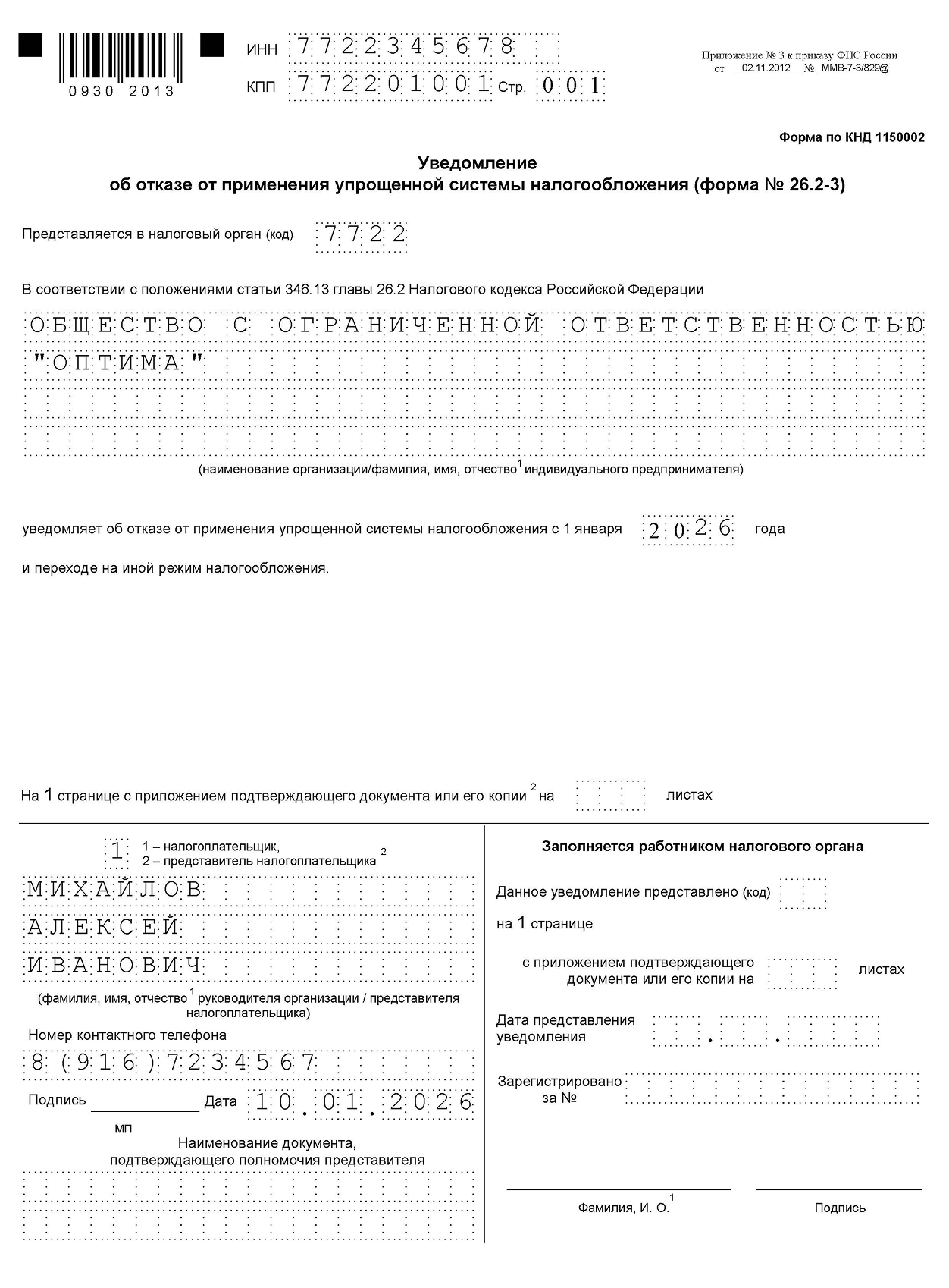 Добровольный переход. Подавайте уведомление об отказе от применения УСН по форме № 26.2-3. Укажите ИНН, для ООО — КПП, код налогового органа, название компании или ФИО предпринимателя, год перехода на общую систему.
