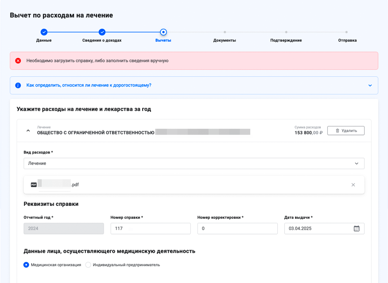 Размер вычета за дорогостоящее лечение — полная стоимость медицинских услуг, но не больше годового дохода, облагаемого НДФЛ.