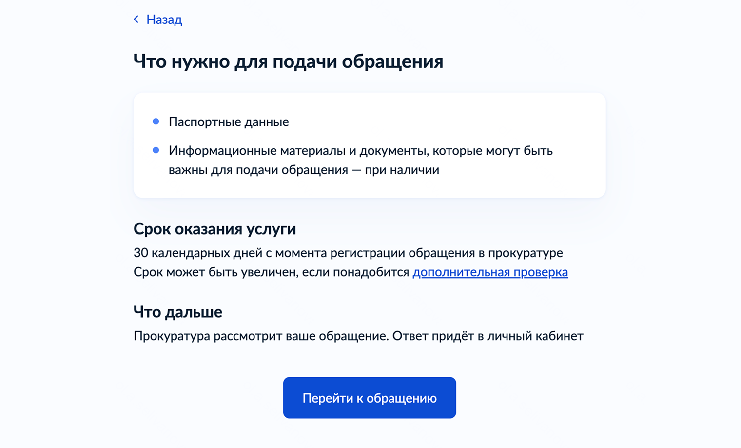 Но есть и исключения — например, сообщение о преступлении. Их регистрируют немедленно, и порядок работы по ним отличается. Как сообщить о преступлении, мы рассказывали в статье «Как обратиться в полицию».