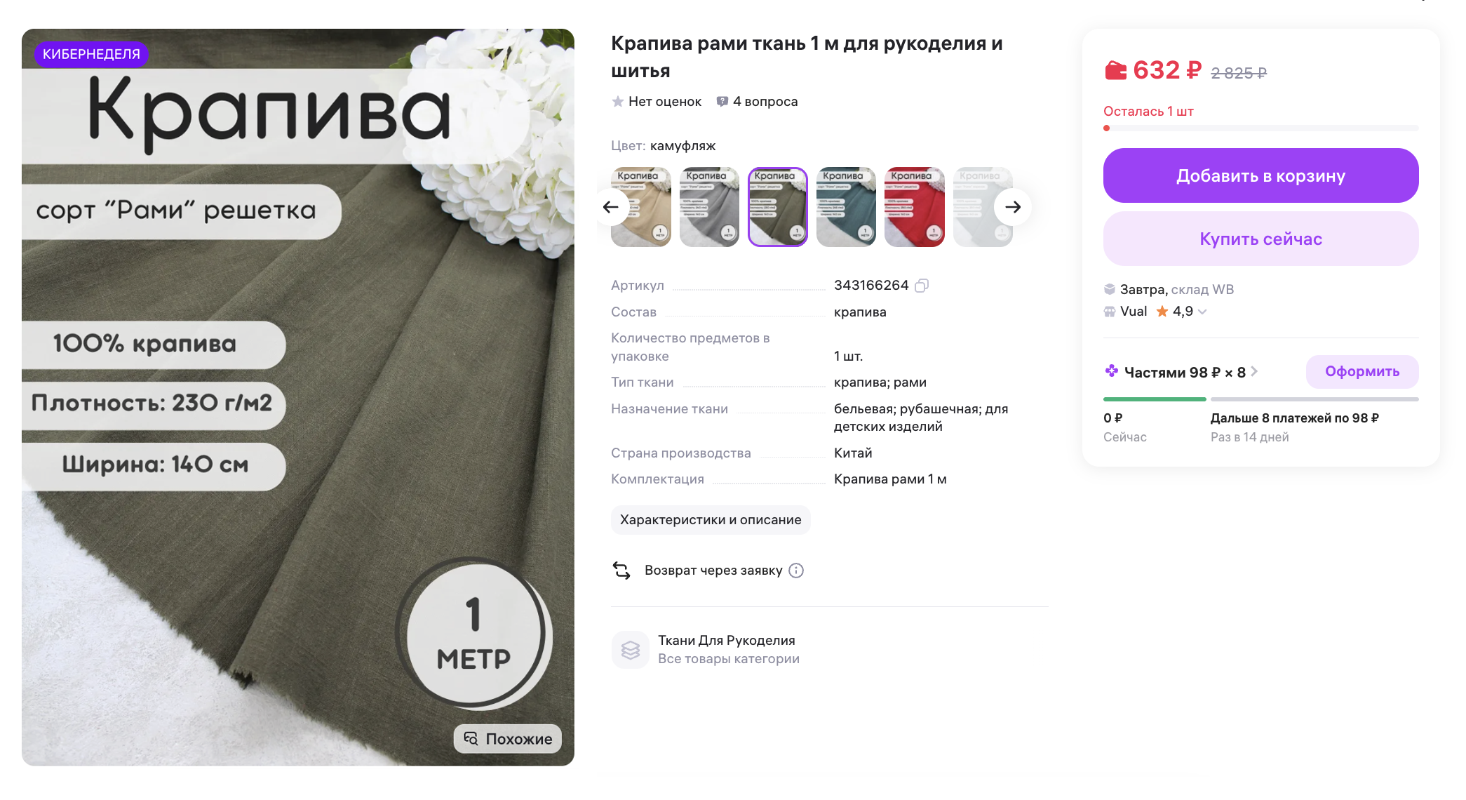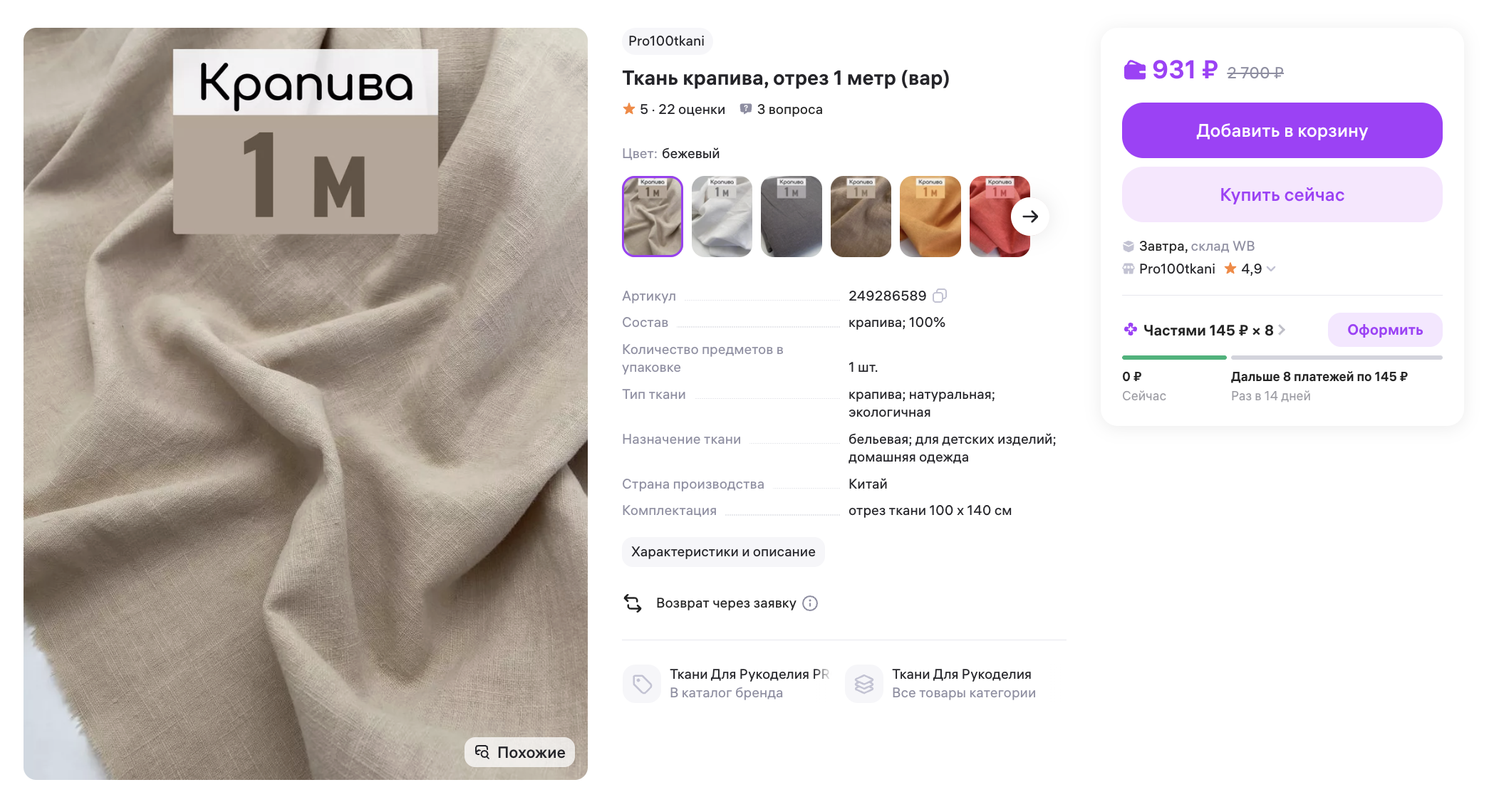 Недавно я познакомилась с поставщиками, которые торгуют на Wildberries: оптом, от 30 м, продают ткани на сайте. Стоимость 1 м в таком заказе — 580 ₽, но цвет будет один.