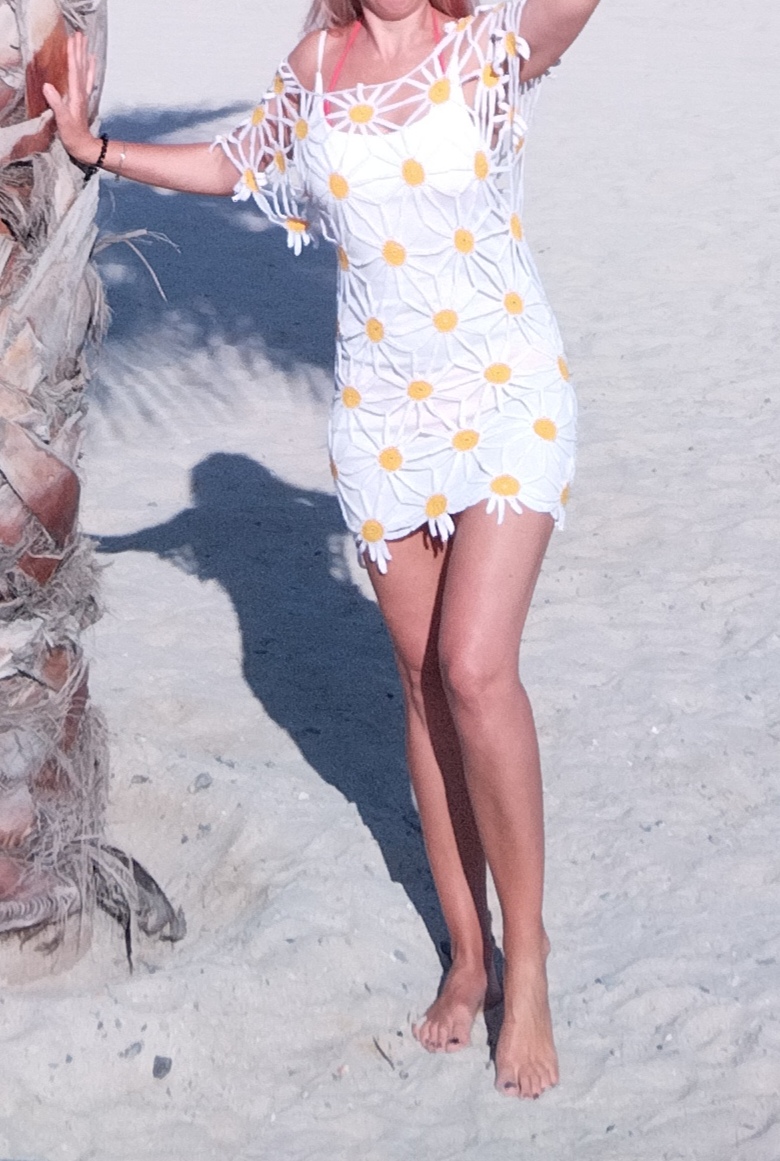А вот для ромашек нашла в интернете картинки по запросу "вязанные кофты, туники с ромашками". Идей было слишком много, сложно остановиться. Я вязала отдельные мотивы в виде цветов, которые соединяются в процессе вывязывания лепестков. Ну и саму ширину и длину уже подгоняла, примеряя на себя.