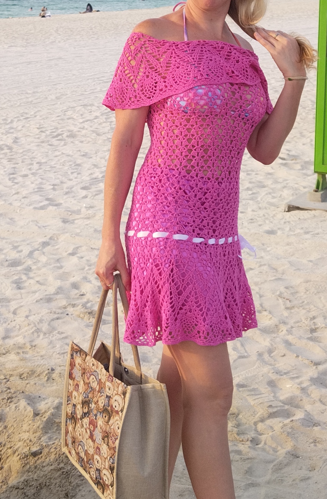 Для розовой туники-платья использовала схему и основу для вязания из журнала. Процесс вязания для основы платья начинается с низу, затем вяжется пройма и плечевая часть-волан, которую приходилось подгонять по себе, чтобы потом платье не спадало с плеч и держалось. И отдельно к нижней части основы привязывается юбка-волан. Здесь тоже полёт для фантазии и выбора схемы, рисунка.
