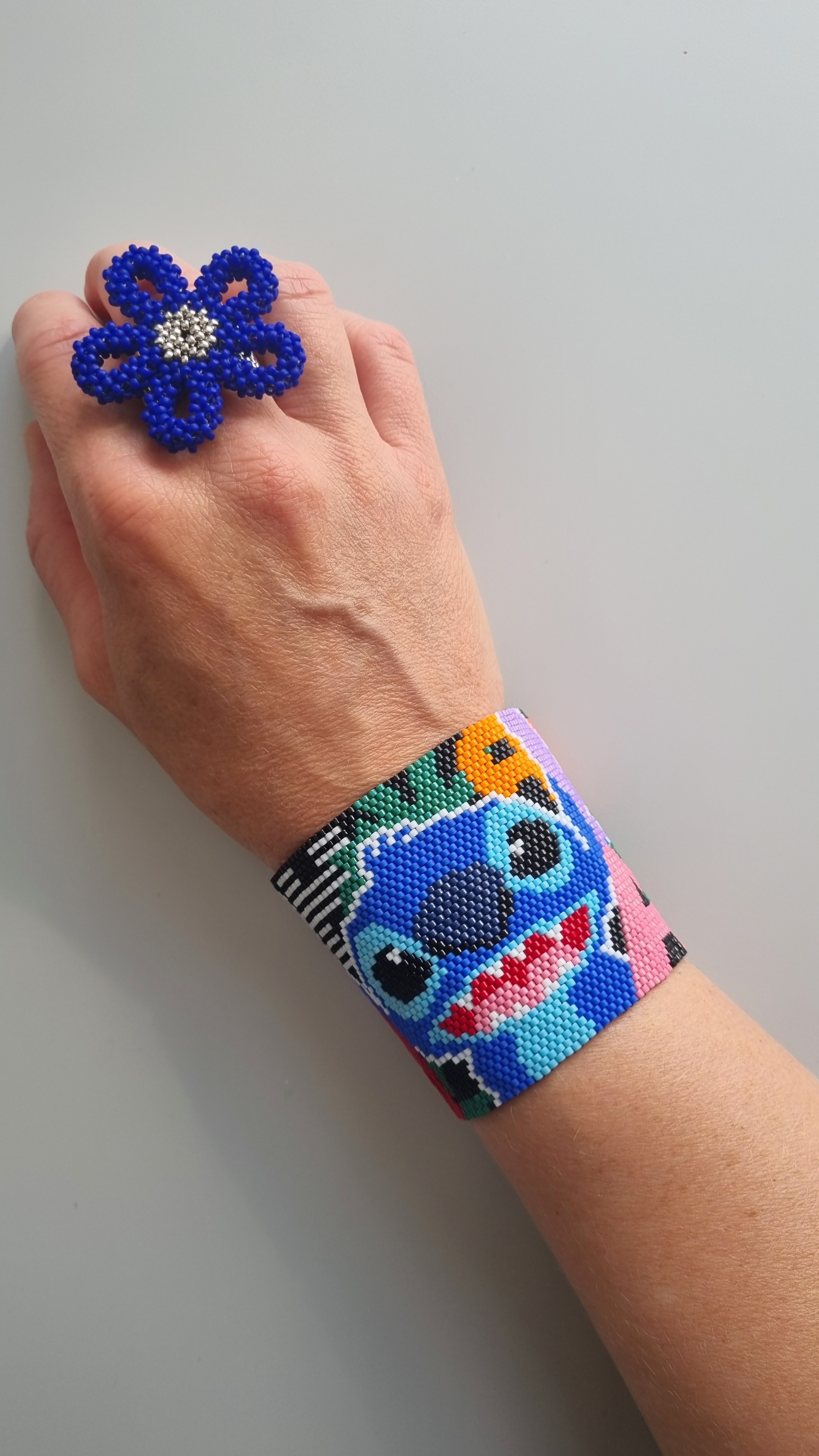 Дизайн браслета придумала сама, схему, как обычно, рисовала на айпаде в Procreate. Больше всего времени занял подбор бисера нужных цветов. Пробовала разные варианты голубого, синего и фиолетового цветов для Стича. После нескольких образцов всё наконец-то сложилось как надо)
