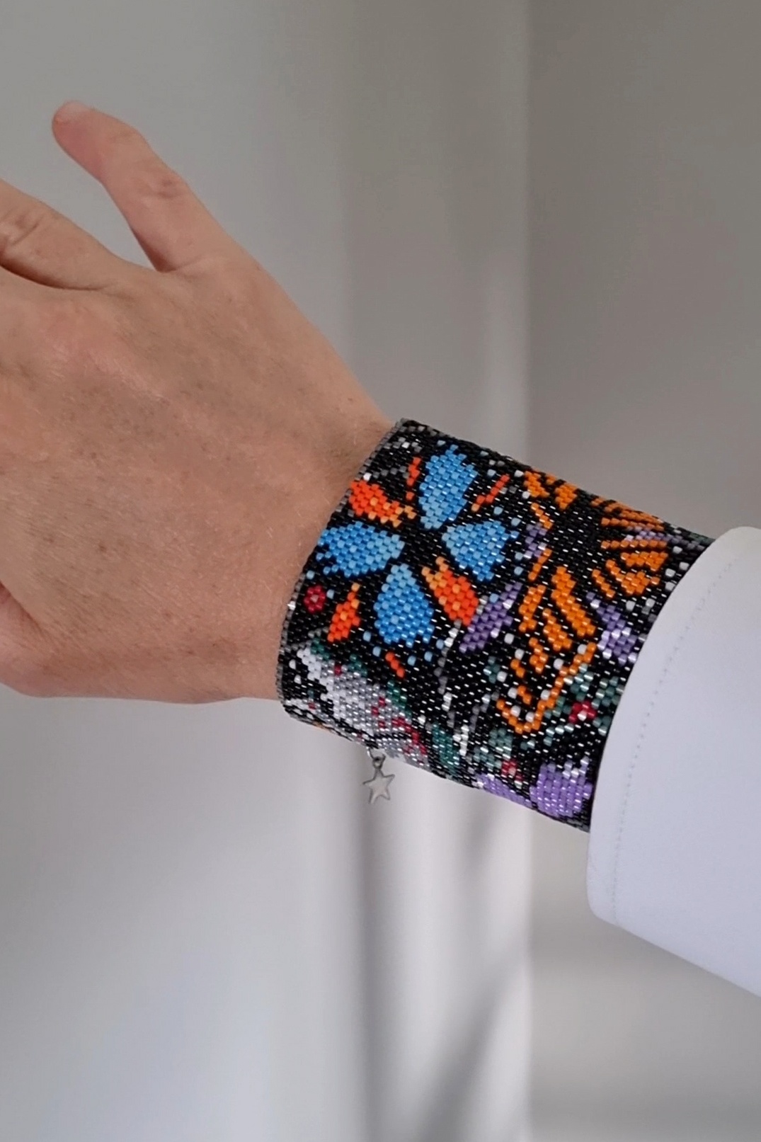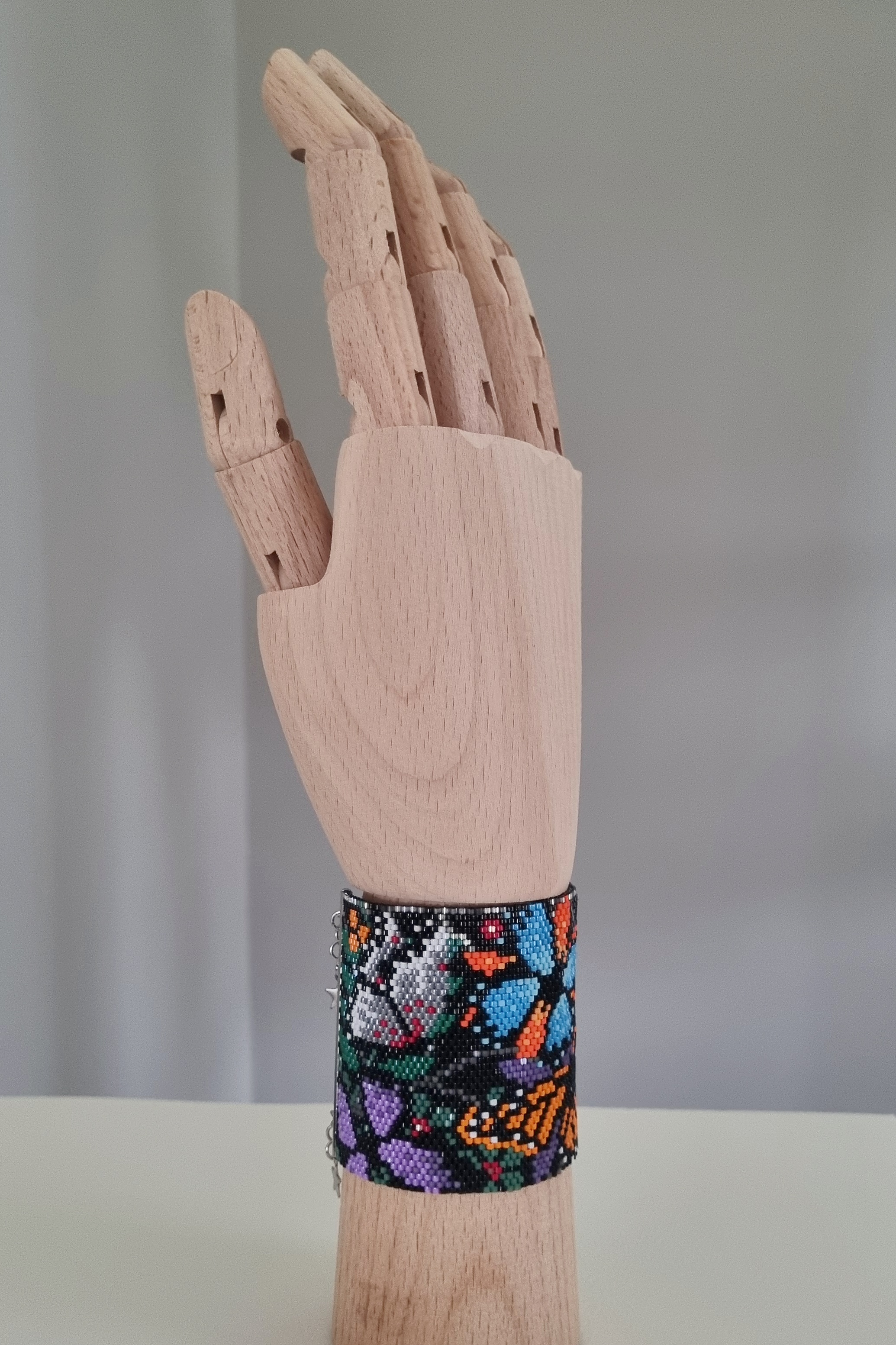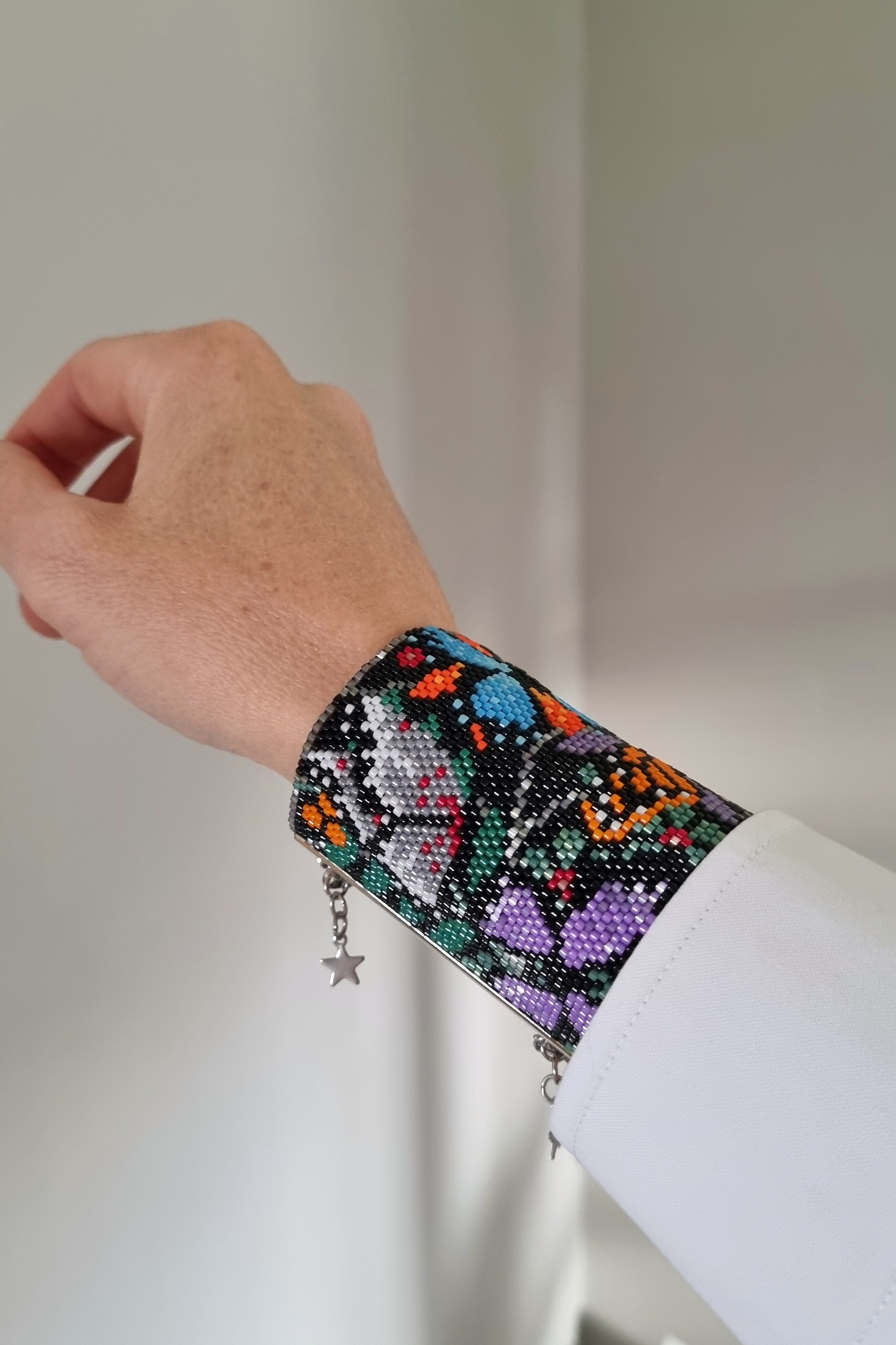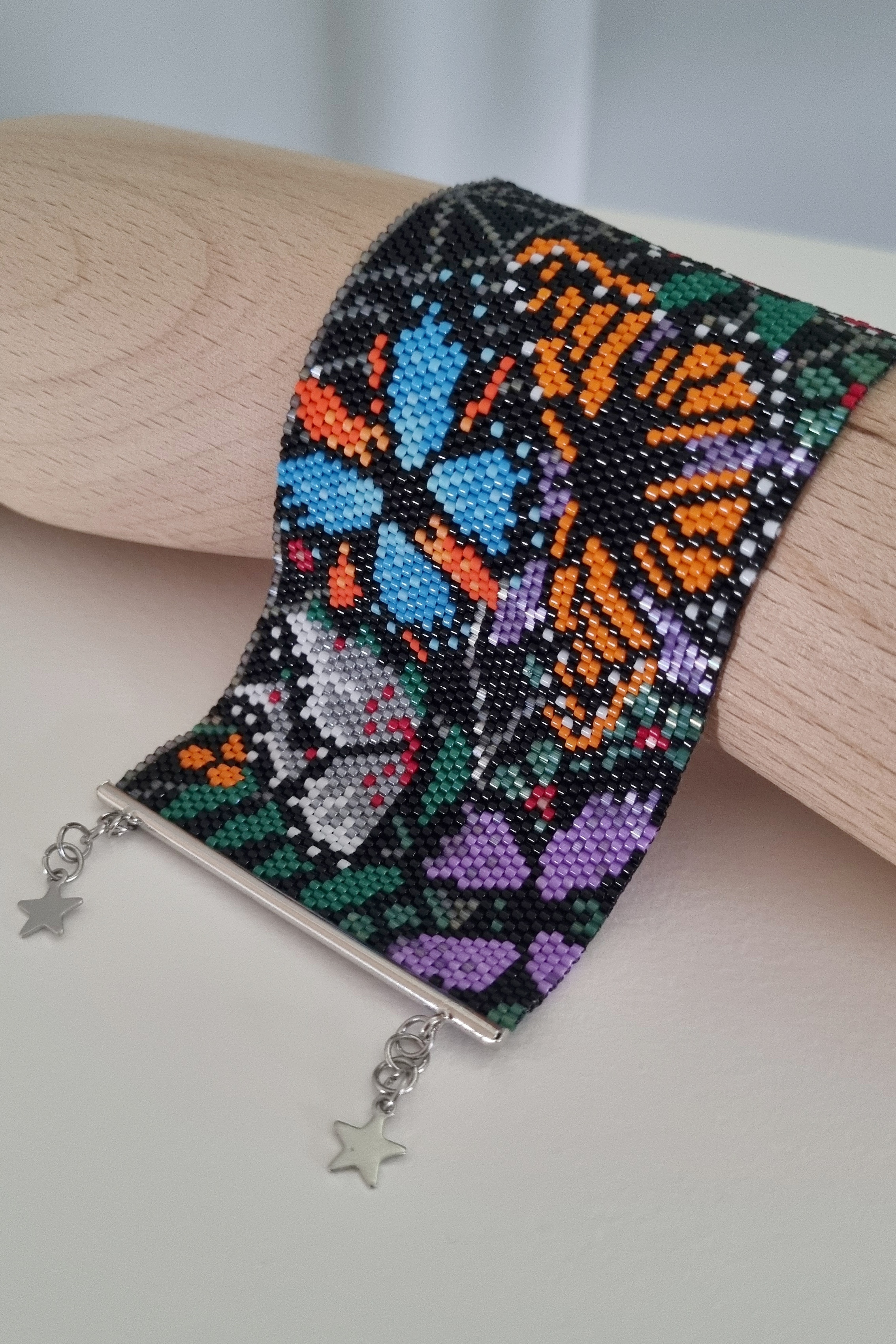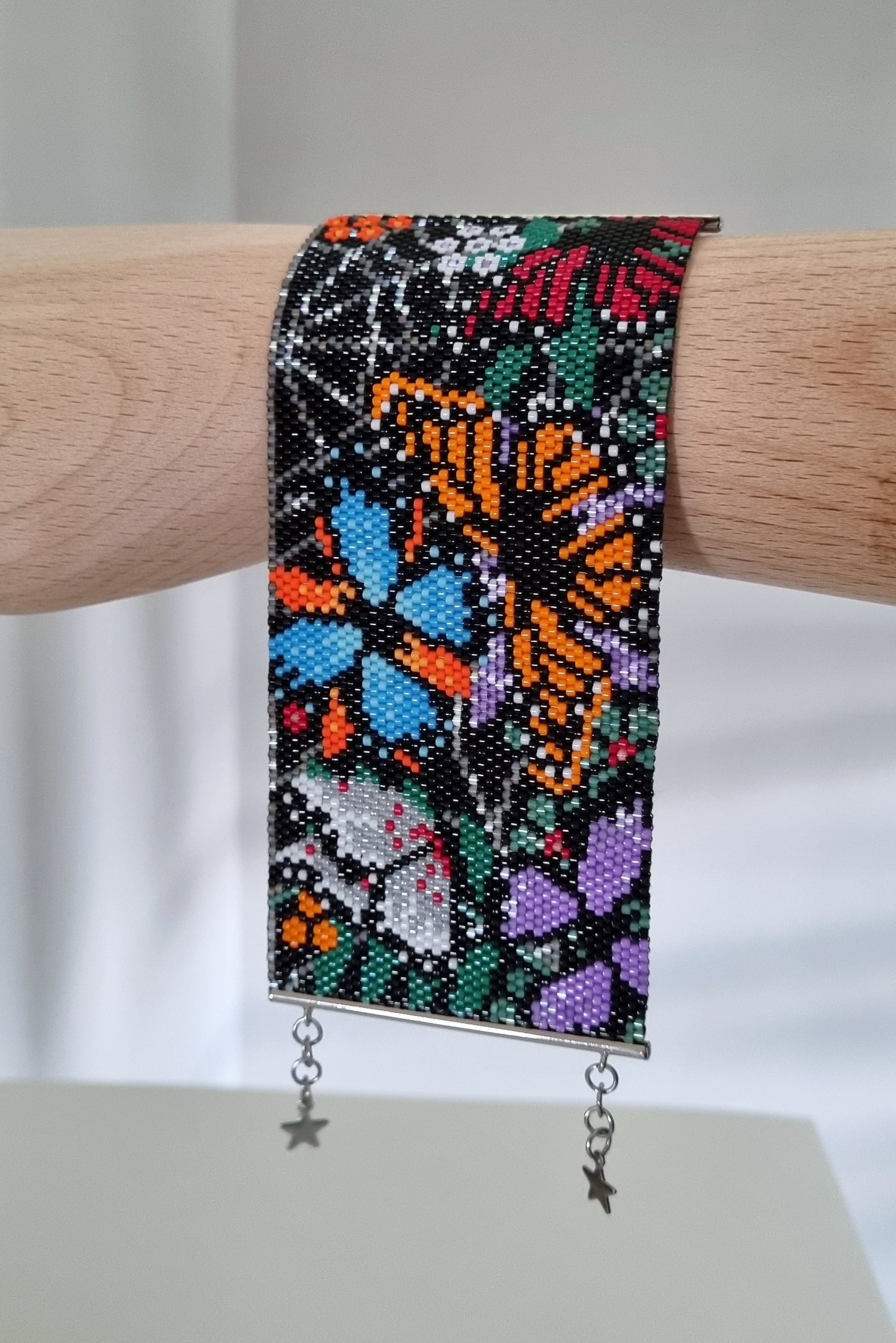 Долго вынашивала идею этого браслета, хотелось создать дизайн с миром насекомых, но в итоге получился мир бабочек, которые беззаботно порхают вблизи опасной паутины). Долго работала над самим рисунком, цветами, расположением элементов, потом несколько раз меняла цвета уже на этапе плетения самого браслета. Хотелось сделать сверкающий браслет именно с черным фоном. Результат порадовал, браслет очень красиво мерцает при приглушенном свете. Мне кажется, отлично подойдет для похода в театр или в ресторан, при вечернем освещении выглядит очень нарядно)