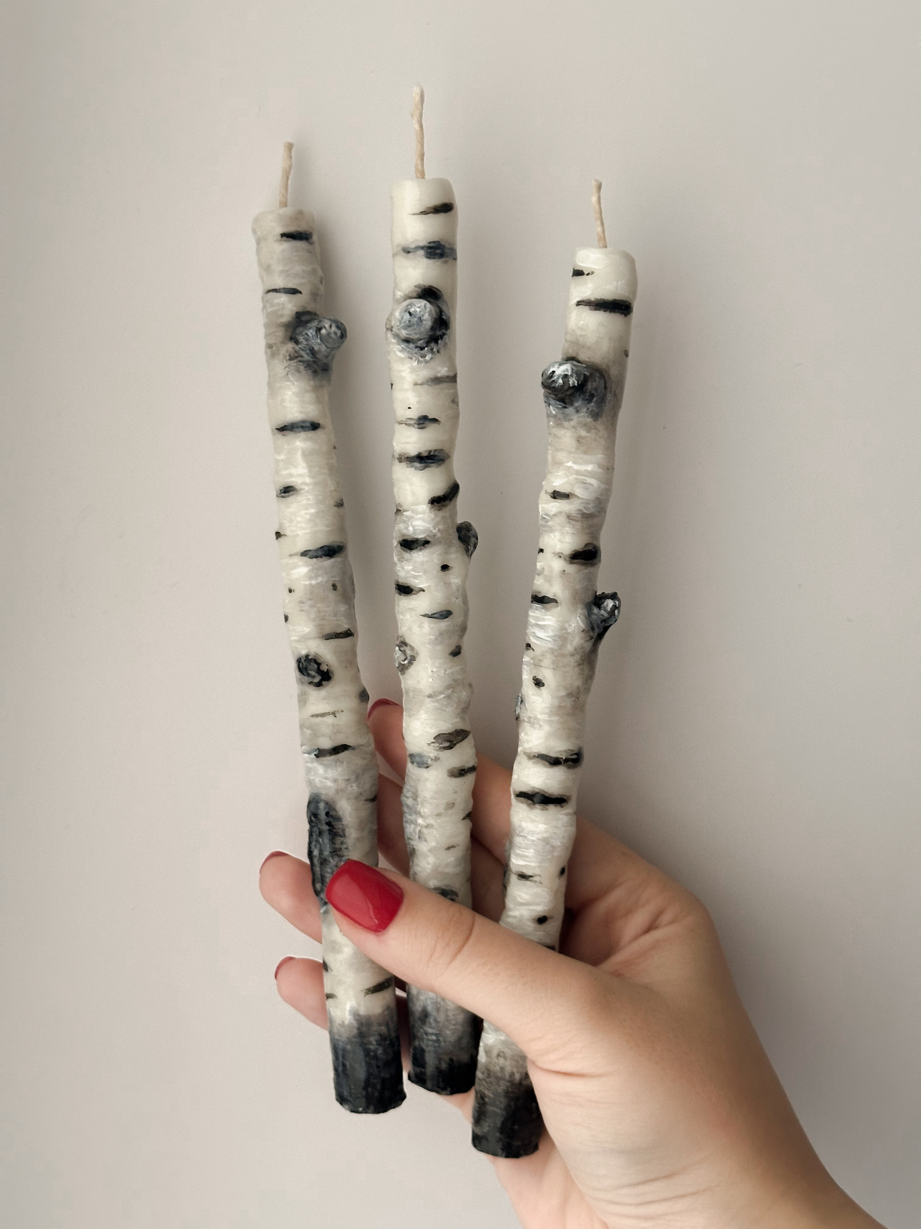 На мой взгляд, получилось просто и красиво: белый воск с легкими серыми узорами и черные «глазки» коры.