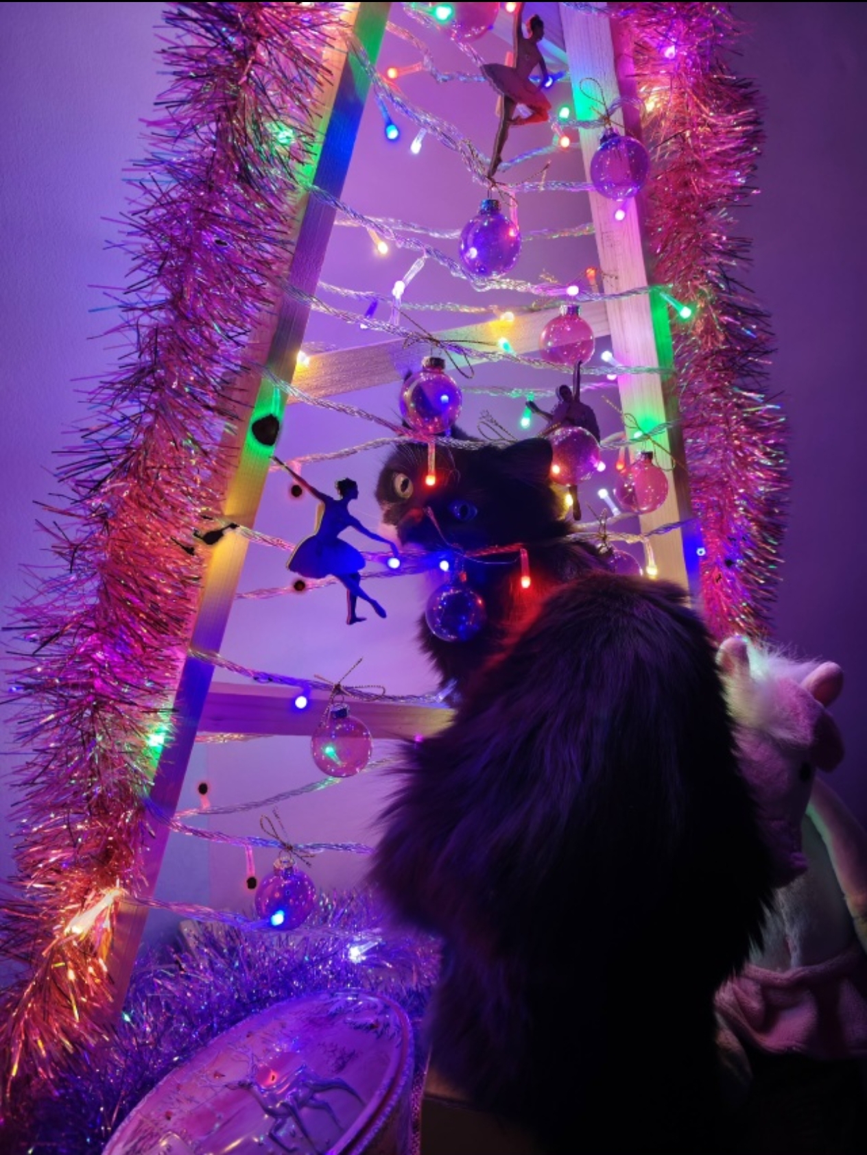 Деревянную ёлку несколько лет назад изобретали специально для нее, опасаясь, что обычную искусственную она или уронит или сгрызет. В первый год кото-елка украшалась пакетиками "Вискаса" на прищепках. Позже просто купила шарики и мишуру в двух оттенках.